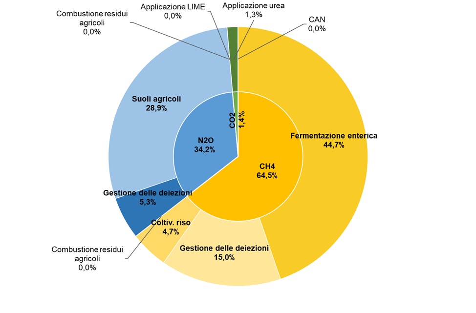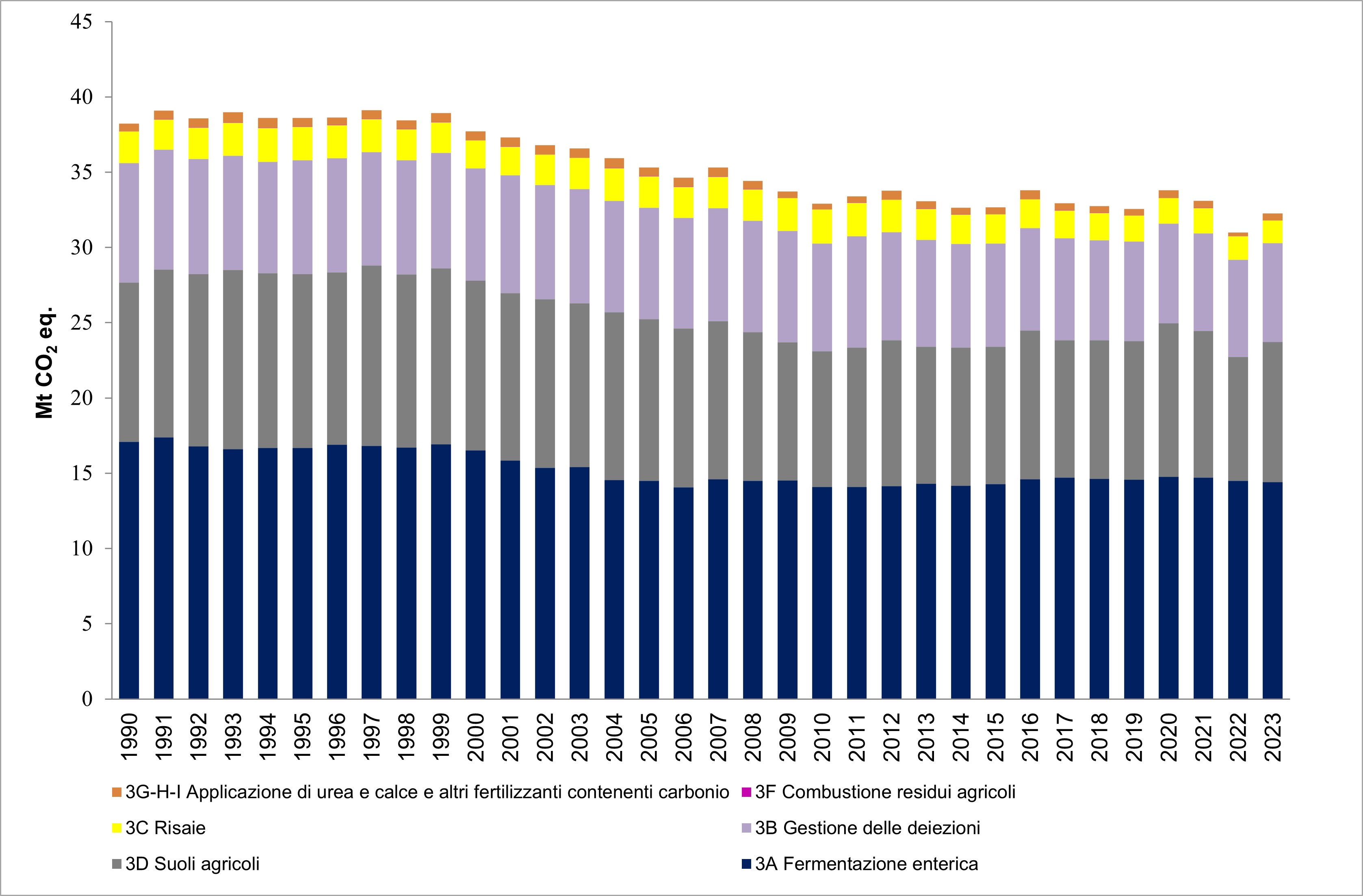 In 2023, agricultural GHG emissions increased by 4.1% compared with the previous year. The analysis by gas and corresponding emission category shows that enteric fermentation (CH₄) accounted for 44.7%, agricultural soils (N₂O) for 28.9%, manure management (CH₄ and N₂O) for 20.3%—of which 15.0% from CH₄ and 5.3% from N₂O—rice cultivation (CH₄) for 4.7%, application of urea and lime and other carbon-containing fertilisers (CO₂) for 1.4%, and burning of crop residues (N₂O and CH₄) for 0.05% (Figure 2).