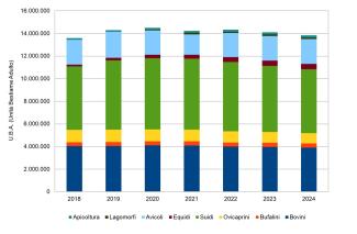 The recorded data indicate that in 2024 — the latest full year available for the main livestock species considered — there was an overall decrease in livestock numbers (expressed in Livestock Units - LSU) of 3.3% over the 2019–2024 period, and a 1.9% decline compared to 2023.