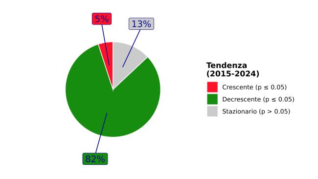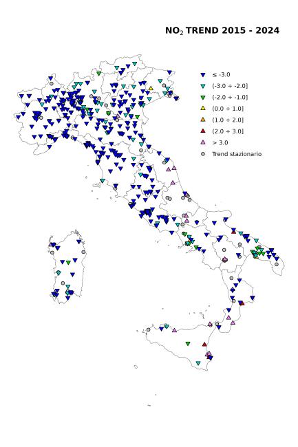 Sintesi dei risultati dell’analisi del trend (2015 - 2024) con il test di Kendall corretto per la stagionalità delle concentrazioni di NO2 in Italia su una selezione di 520 stazioni di monitoraggio distribuite sul territorio nazionale