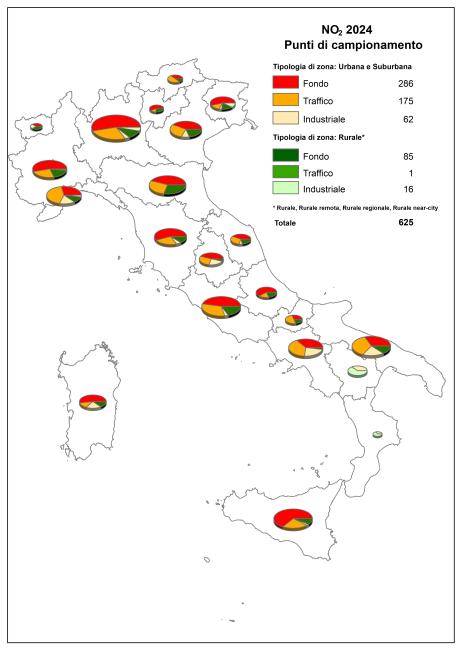 The indicator is based on nitrogen dioxide (NO₂) concentration data measured in 2023 at monitoring stations distributed across the national territory, collected and archived by ISPRA in the InfoAria database, in accordance with Directive 2008/50/EC (and its national transposition, Legislative Decree 155/2010) and Commission Implementing Decision 2011/850/EU. A total of 630 monitoring stations measured and reported NO₂ data. Of these, 600 provided data series with sufficient temporal coverage to verify compliance with reference values.