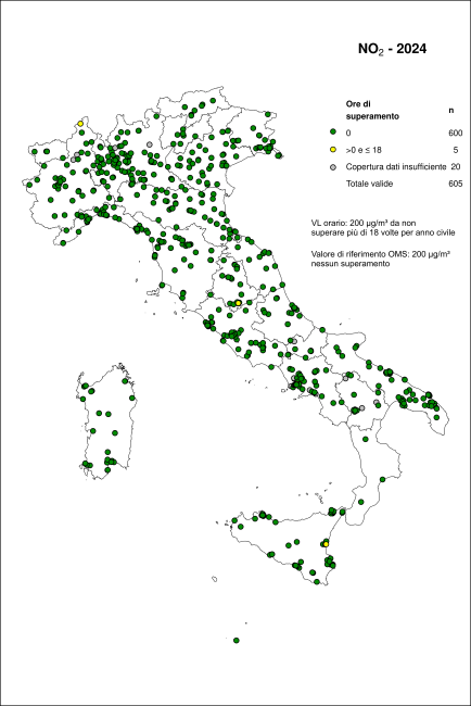 The indicator is based on atmospheric nitrogen dioxide (NO₂) concentration data measured at monitoring stations distributed across the national territory, collected and archived by ISPRA in the InfoAria database, in accordance with Commission Implementing Decision 2011/850/EU. Parameters were calculated for comparison with the limit values for human health protection established by the reference legislation (Legislative Decree 155/2010) and with the WHO guideline values for health protection. All parameters were calculated following European standards and were validated by the National System for Environmental Protection (SNPA).