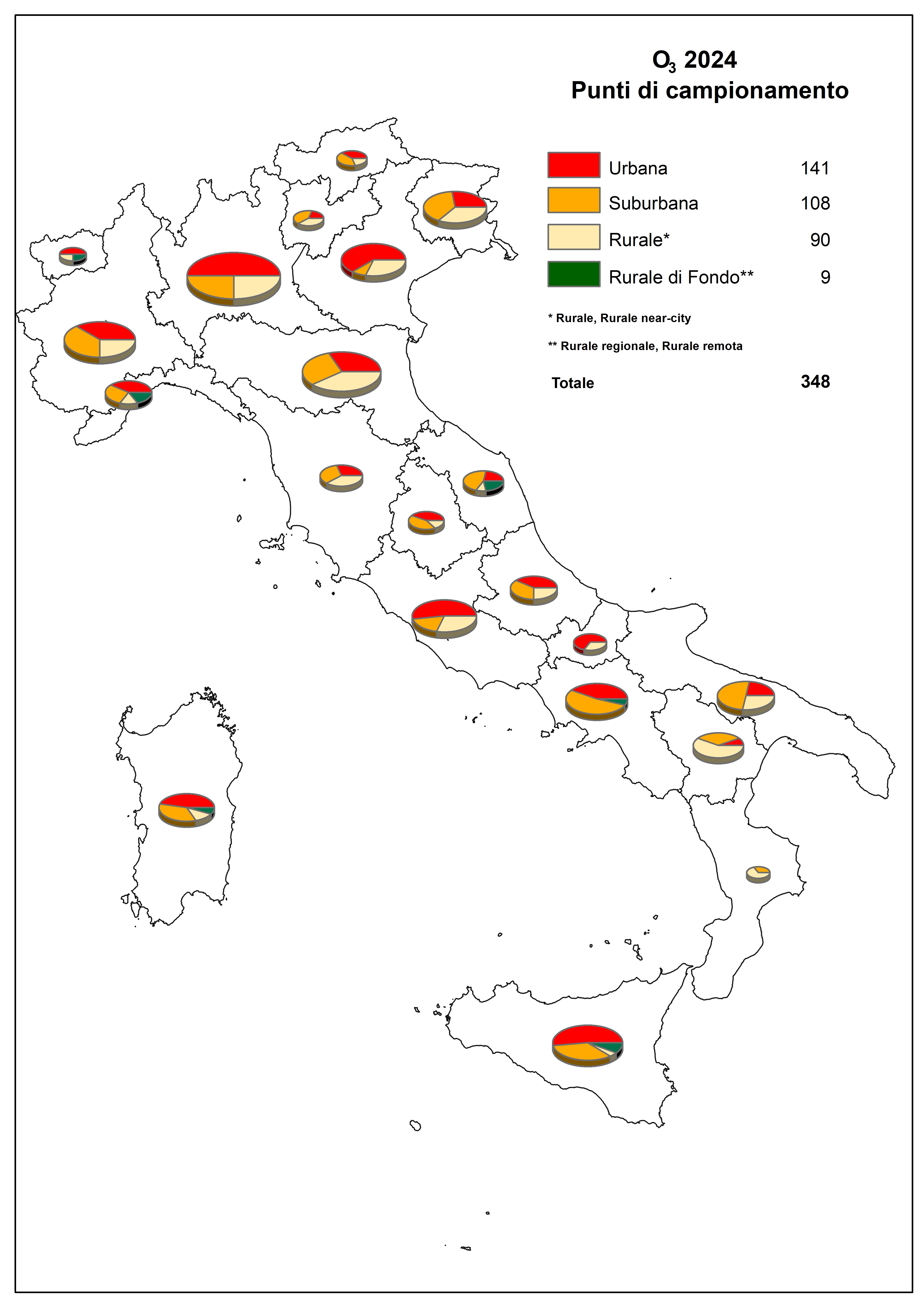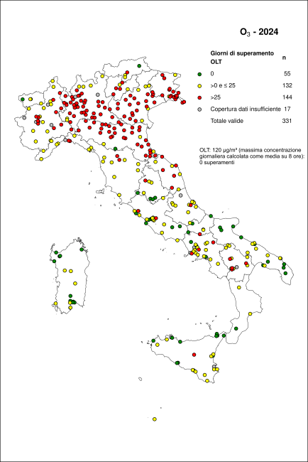 The indicator is based on atmospheric ozone (O₃) concentration data measured in 2023 at monitoring stations distributed across the national territory, collected and archived by ISPRA in the InfoAria database, in accordance with Directive 2008/50/EC (and its national transposition, Legislative Decree 155/2010) and Commission Implementing Decision 2011/850/EU. A total of 348 monitoring stations measured and reported ozone data. Of these, 326 provided data series with sufficient temporal coverage to assess compliance with threshold values and the long-term objective (LTO) for the protection of human health.