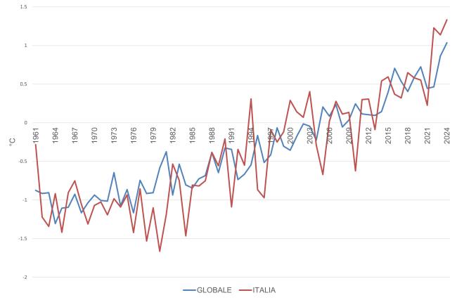 The increase in mean temperature recorded in Italy over the last thirty years has often exceeded the global average over land. In 2024, the mean temperature anomaly in Italy, relative to the 1991–2020 climatological baseline, was +1.33 °C—higher than the global land surface anomaly of +1.03 °C. In Italy, 2023 ranked as the warmest year in the entire annual time series starting from 1961. Since 2000, temperature anomalies relative to the 1991–2020 baseline have consistently been positive, except for four years (2004, 2005, 2010, and 2013).