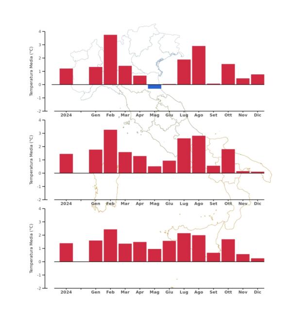 In 2024 (Figure 1), the mean temperature anomaly in Italy (+1.33 °C) was higher than the global land average anomaly (+1.03 °C), compared to the 1991-2020 climatological baseline.