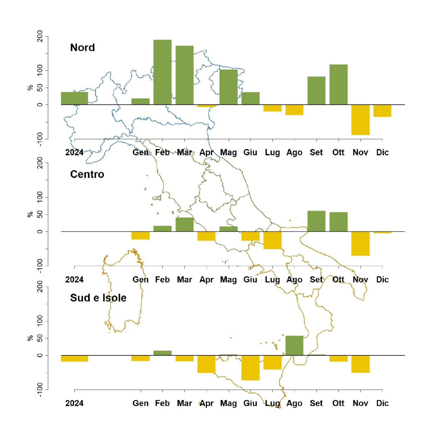 As shown in Figure 2, 2024 was characterised by alternating monthly positive and negative anomalies throughout the year. Precipitation was below average across the country in April, July and November, and above average in February, May and September. The most pronounced anomalies occurred in northern Italy, with positive deviations in February (+190%) and March (+172%), and a strong negative deviation in November (–88%). In central Italy, anomalies ranged from –70% (November) to +60% (September), while in southern Italy and the islands they ranged from –73% (June) to +57% (August), with predominantly negative anomalies.