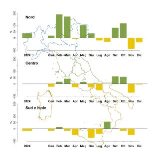 Figure 2: Monthly and annual mean anomaly for 2024, expressed as percentage values, of cumulative precipitation in Northern, Central, and Southern Italy and the Islands, relative to the 1991–2020 climatological norm.
