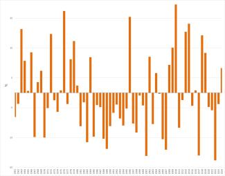 Figure 1: Time series of annual mean anomalies in cumulative precipitation in Italy relative to the 1991-2020 normal valure