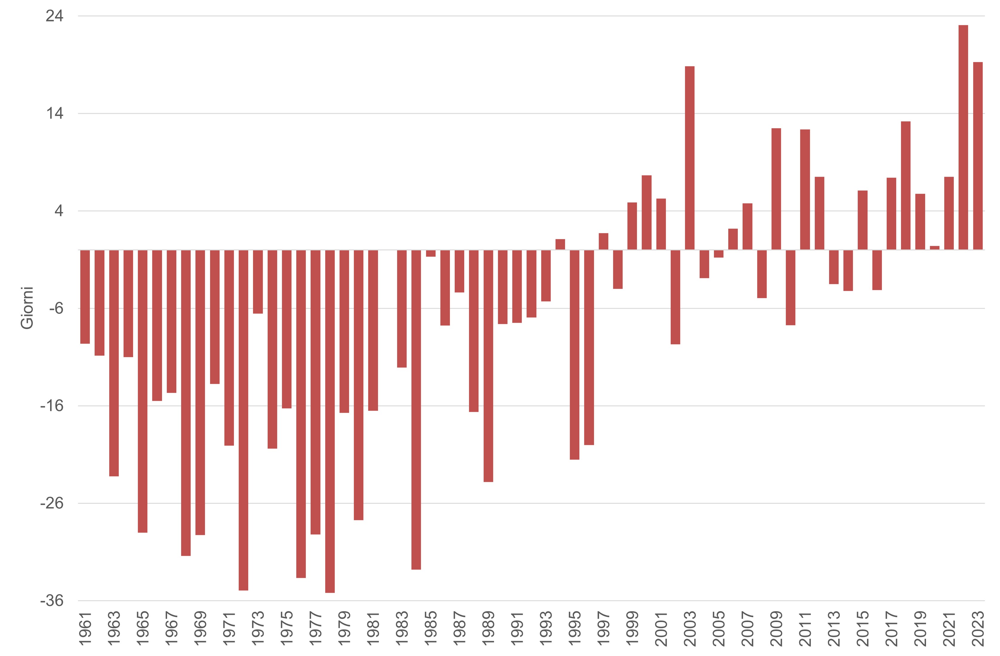 The indicator describes the trend in extreme heat events in Italy, specifically representing the number of days with a maximum daily air temperature exceeding 25 °C. In 2024, an increase of approximately 6.9 summer days was observed compared to the climatological average for the 1991–2020 reference period.
