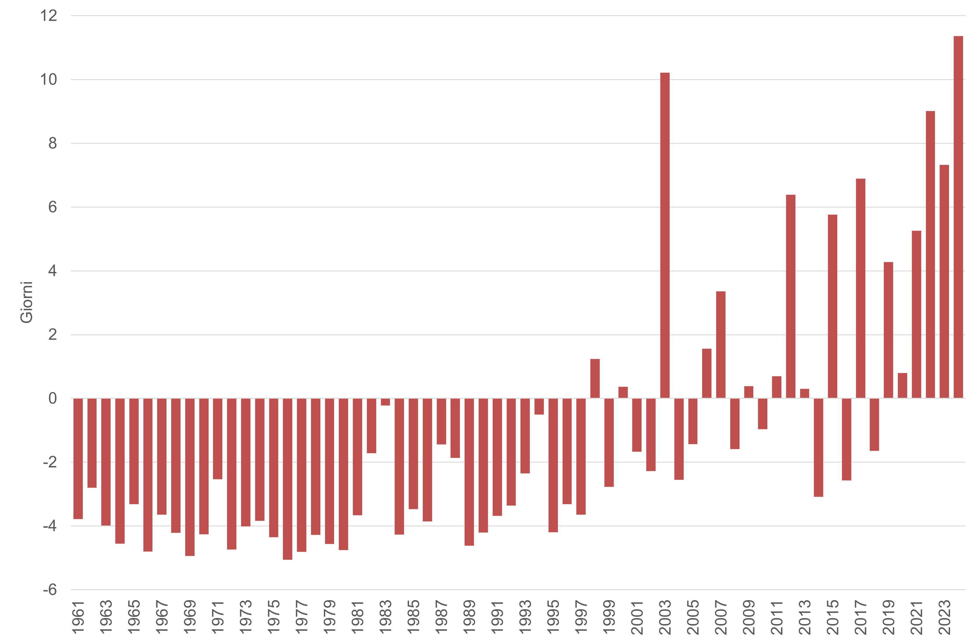 The time series of annual average anomalies for the number of hot days in Italy indicates that 2024, with an increase of approximately 11.4 days compared to the average value calculated for the reference thirty-year period (1991-2020), ranks firts among the highest in the entire time series (Figure 1).
