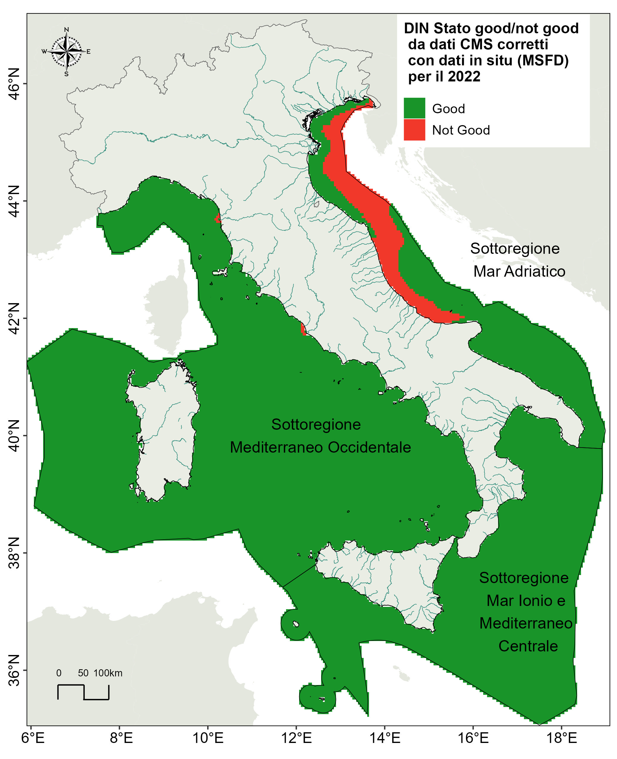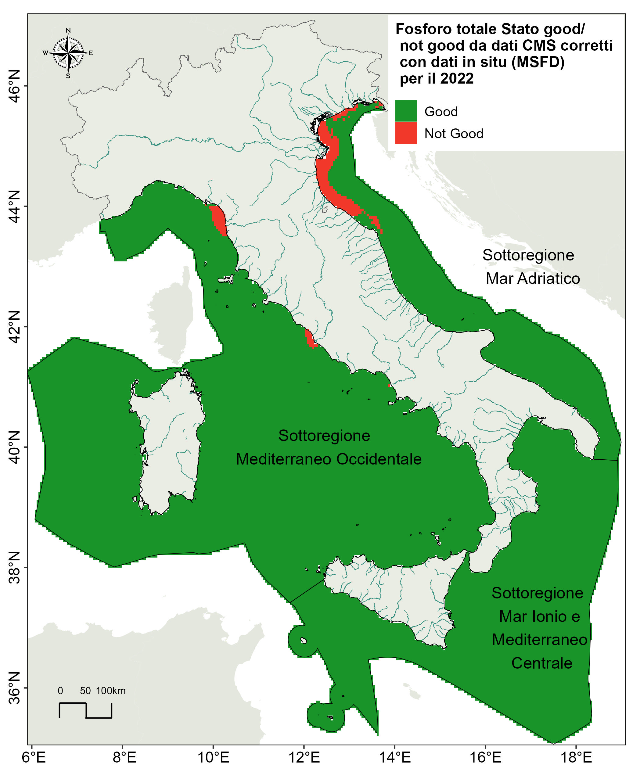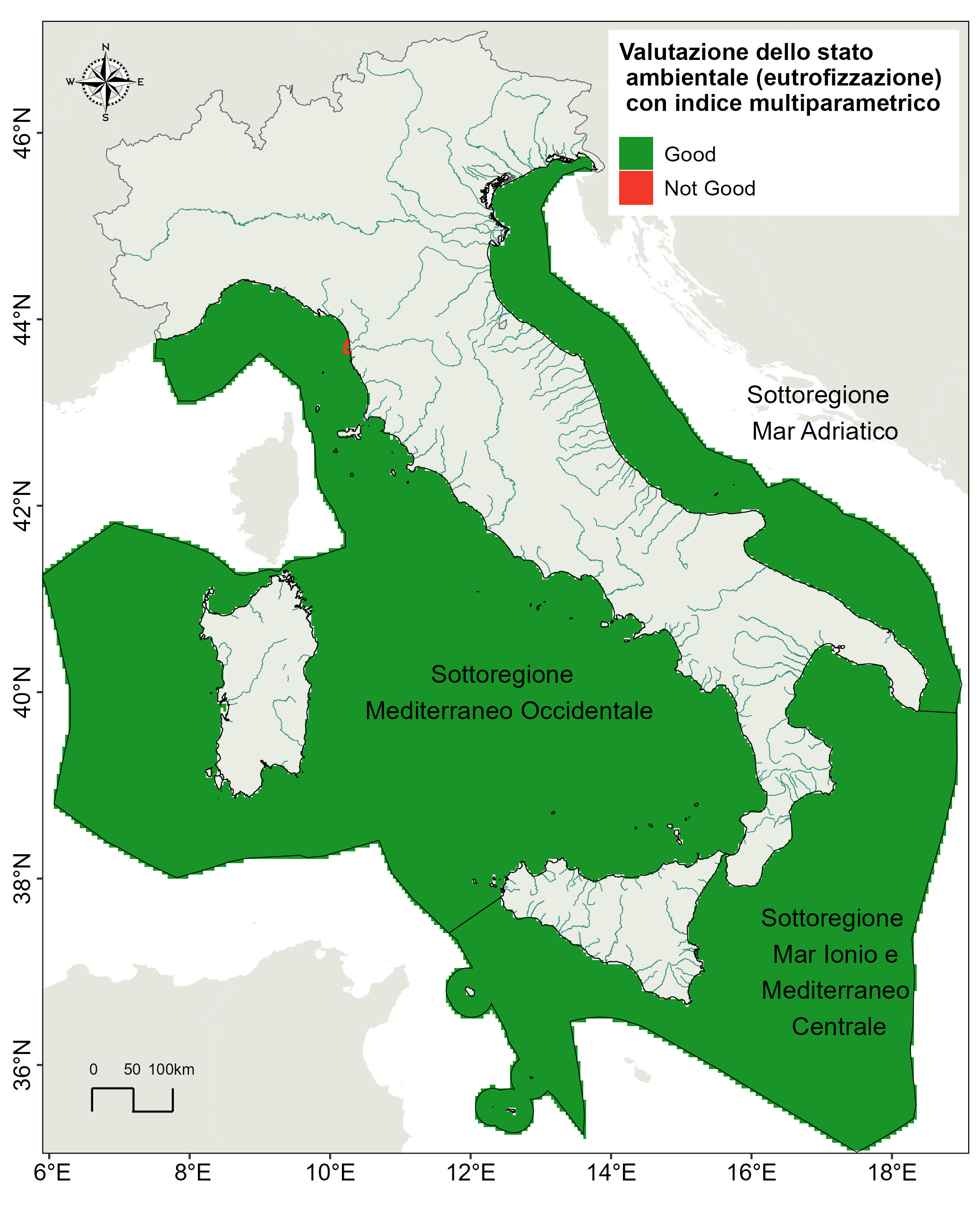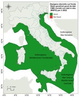 For 2022, the annual assessment of the environmental state (Good/notGood) is reported, carried out by adopting the same methodological approach as the six-yearly assessment, i. e. The use of a multiparametric index that equally weighs the 3 primary criteria of EU Decision 2017/848: surface concentration of nutrients, surface concentration of chlorophyll 'a' and concentration of dissolved oxygen in bottom waters.