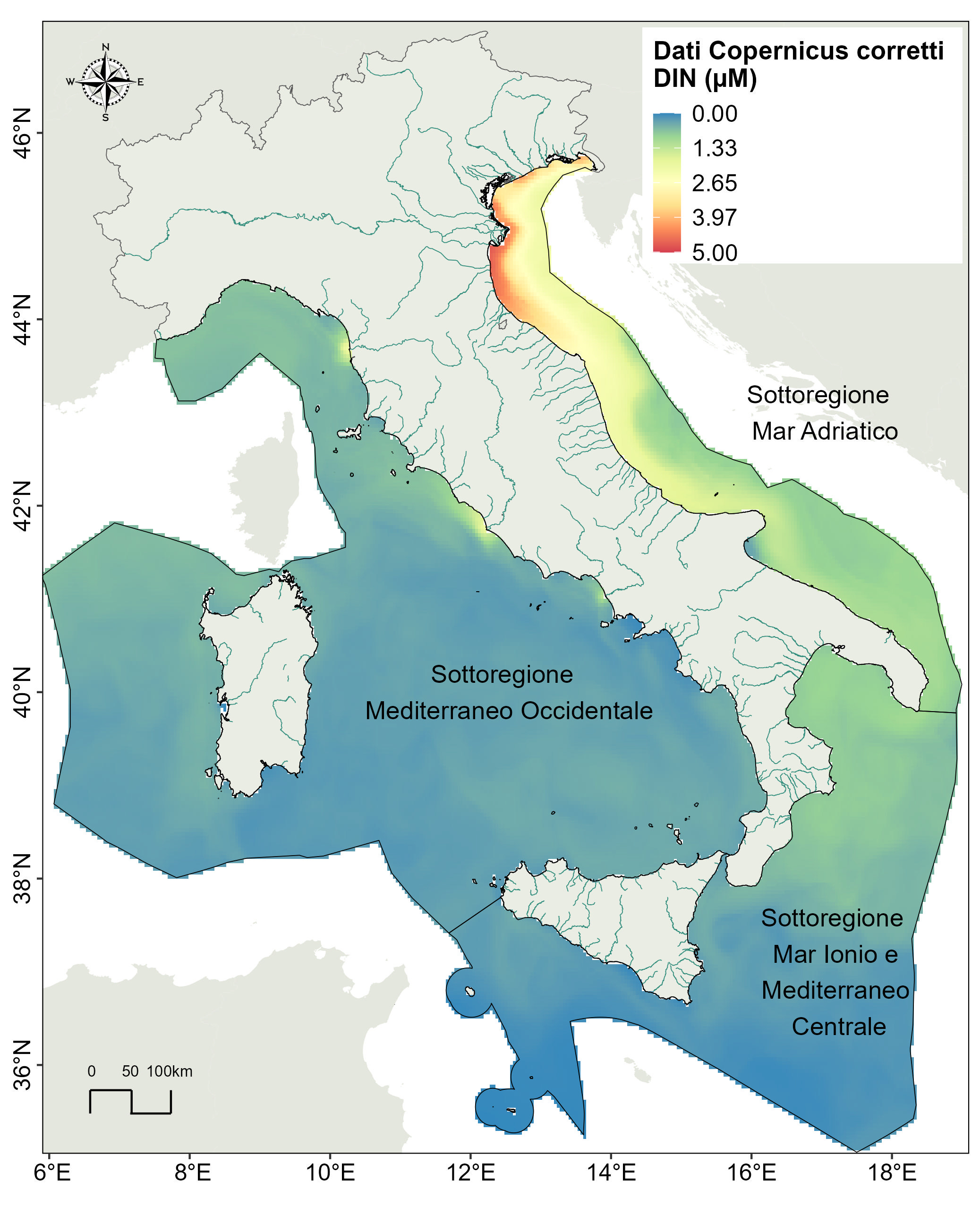 To estimate the concentrations of chlorophyll 'a' (Chla), dissolved inorganic nitrogen (DIN), total phosphorus (TP) and background dissolved oxygen, the products of the Copernicus Marine Service based on modeling were used for both the physical component (Med‐MFC) and the biogeochemical component (MedBFM3), corrected within 12 nautical miles from the coast with the in situ data of the monitoring conducted by the ARPA pursuant to of Directive 2008/56/EC. DIN is calculated as the sum of the inorganic nitrogen present in water in the chemical forms of ammonium ion (N-NH 4) and nitrate ion (N-NO 3) since the nitrite ion (N-NO 2) was always present in very low concentrations. To assign the Good/notGood status to each parameter, the type-specific threshold values (see Table 1) reported in Table 2 were used. These threshold values were defined at EU and/or Mediterranean level (Barcelona Convention).