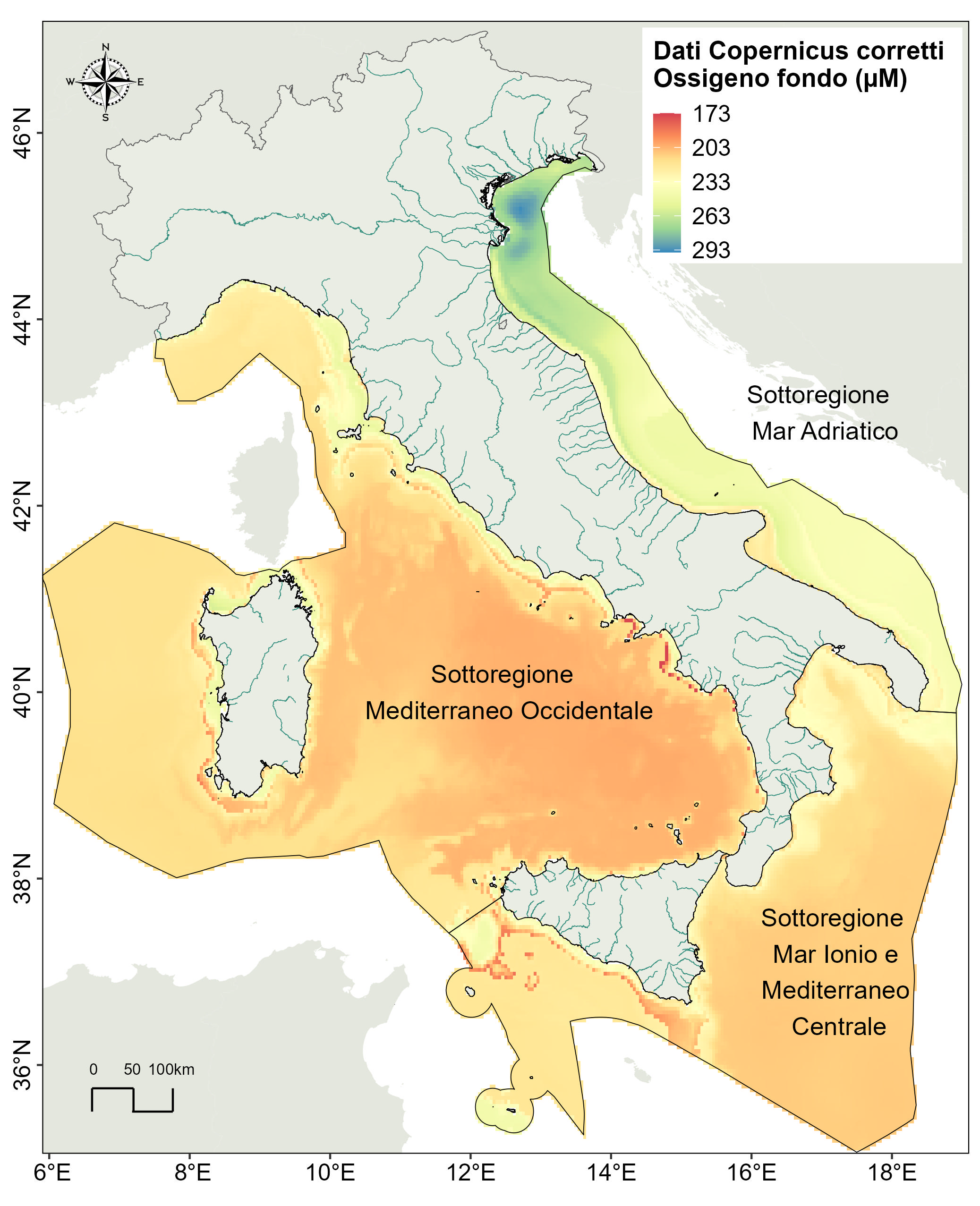 The Marine Strategy Framework Directive (MSFD, 2008/56/EC), implemented by Legislative Decree 190/2010, has as its objective the achievement of Good Environmental Status (GES) according to the criteria and methodological standards established by the European Commission Decision of 17 May 2017 (EU Decision 2017/848). The threshold values used to evaluate the environmental state of marine waters for each variable considered are shown in Table 2. In particular, for Italian waters, the achievement of GES or not is assessed using a multiparametric index that equally weighs the 3 primary criteria of EU Decision 2017/848, namely nutrient concentration, surface concentration of chlorophyll 'a' and dissolved oxygen concentration of bottom waters.