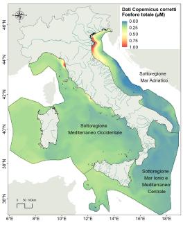 The distribution of nutrients (DIN and TP, Figures 6 and 7) highlights the achievement of good status for all waters except in some areas of the Adriatic and in very limited areas of the Tyrrhenian Sea, where the aforementioned parameters exceed the threshold values (Table 2). This result is attributable to the nitrogen and phosphorus loads.
