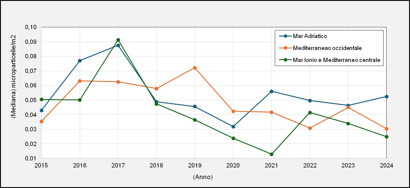 Since 2015, Italy, in implementation of the Marine Strategy Framework Directive (2008/56/EC), has implemented an extensive marine litter monitoring program, including microlitter present in the surface layer of the water column. The activity is conducted by the National System for Environmental Protection (SNPA), with the coordination of the Ministry of the Environment and Energy Security (MASE). Microwaste, particles of anthropic origin smaller than 5 mm, derive from both primary sources (industrial pellets, cosmetic microgranules, abrasives) and secondary sources (fragmentation of macrowaste). Their composition, quantity and distribution constitute a key parameter for assessing the good environmental status of marine waters. The processing of data collected from 2015 to 2024 highlights a stable median density of 0.04 microparticles/m² (approximately 40,000 microparticles/km²), with interannual and spatial variations linked to the different hydrodynamic conditions and anthropic pressures of the Italian marine subregions. In 2024 there is an increase in concentrations in the Adriatic Sea and a decrease in the Ionian Sea and the western Mediterranean. At Mediterranean level, the Barcelona Convention has defined a threshold value of 0.000845 microparticles/m² (845 microparticles/km²) for achieving good environmental status: the values found in Italian seas, although stable in recent years, are still significantly higher.