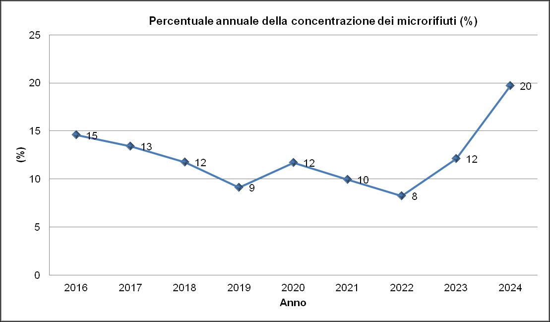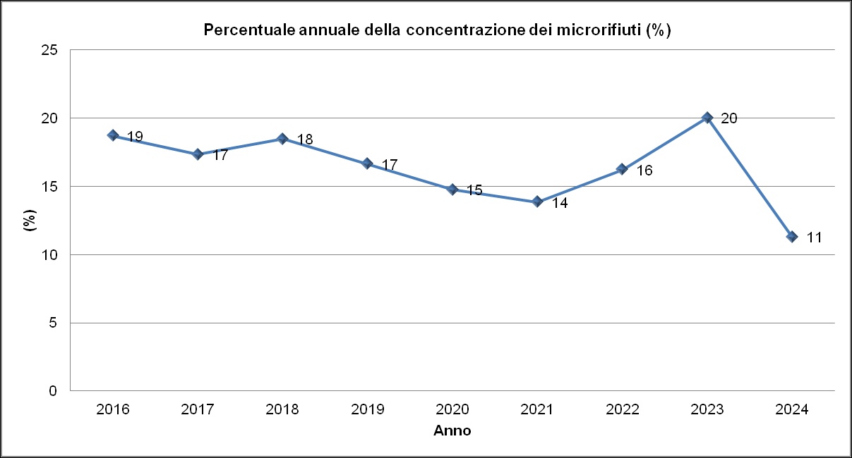 Le linee blu rappresentano le percentuali annuali delle concentrazioni dei microrifiuti rispetto al totale nazionale.