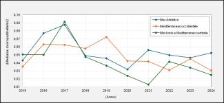 In 2024, the median concentrations of marine microlitter in the three Italian sub-regions (Adriatic Sea, Western Mediterranean, Ionian Sea and Central Mediterranean) show values between 0.025 and 0.052 microparticles/m² (Figure 1). Although in some areas a reduction is observed compared to previous years, the levels recorded still remain well above the threshold value defined under the Barcelona Convention, equal to 0.000845 microparticles/m².