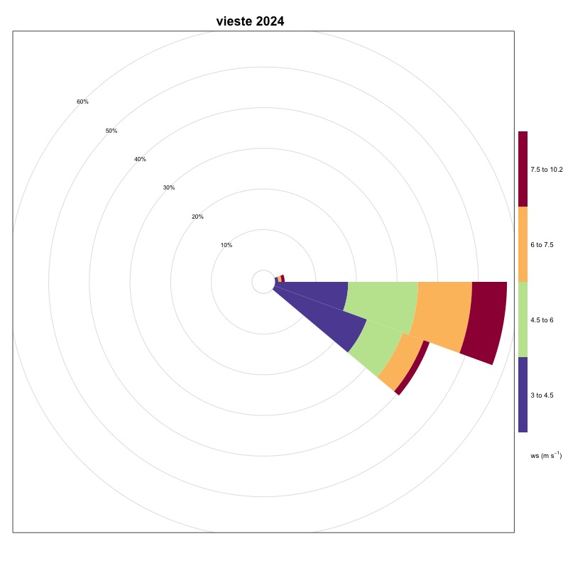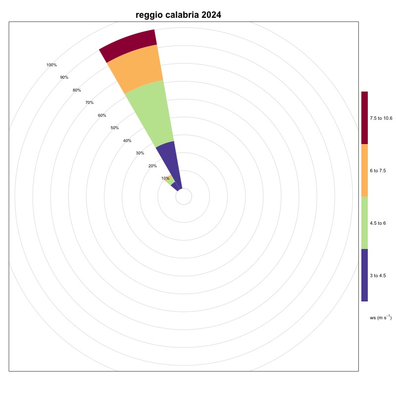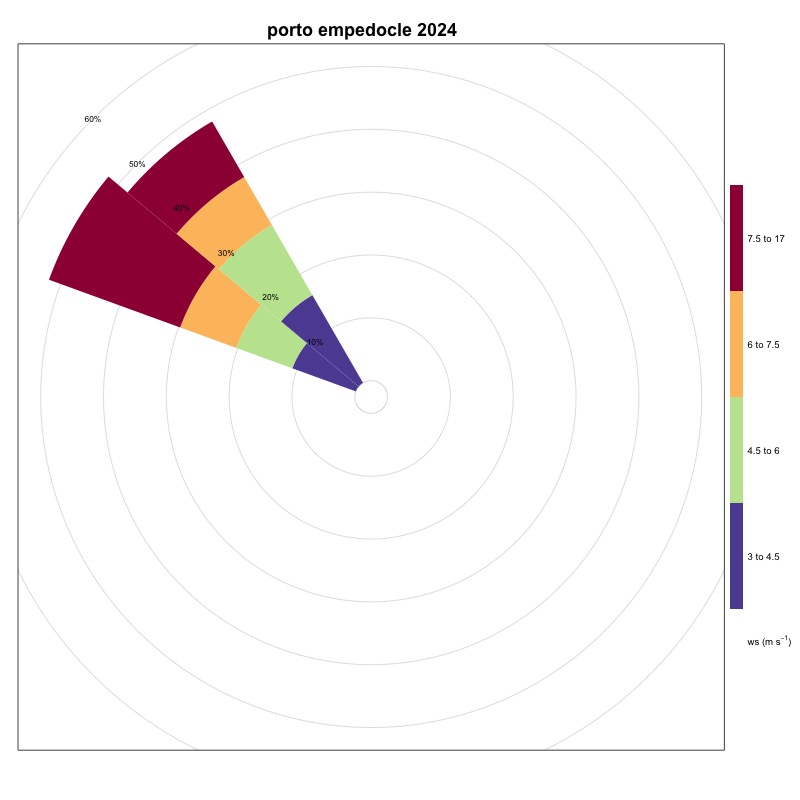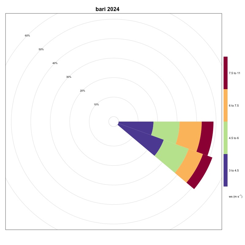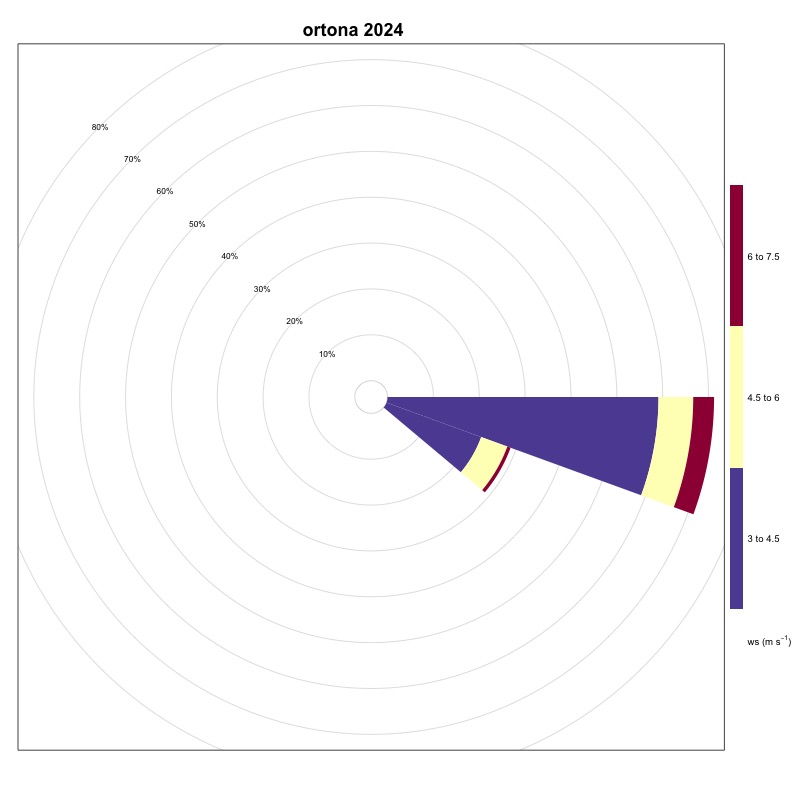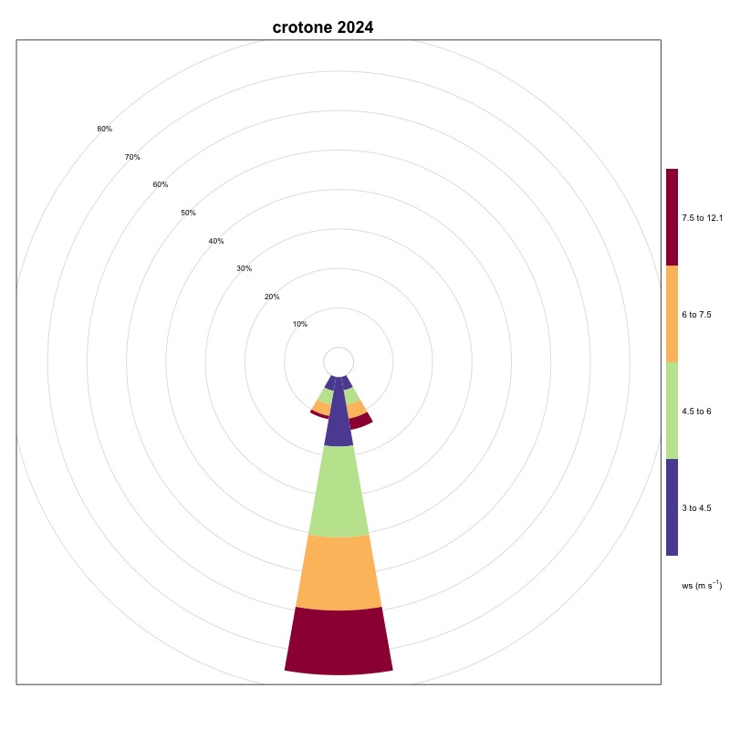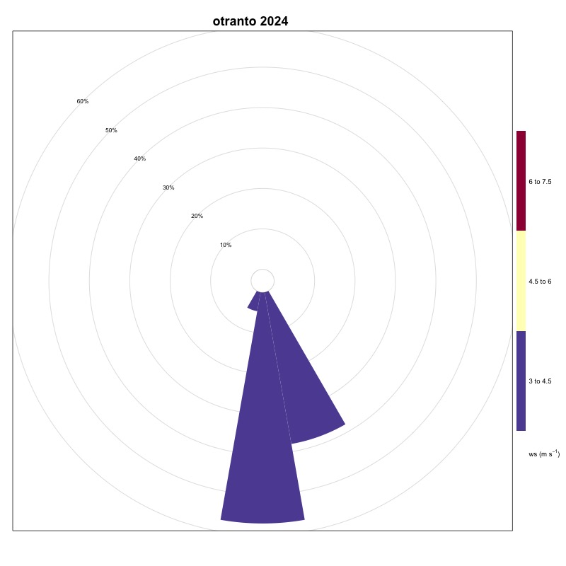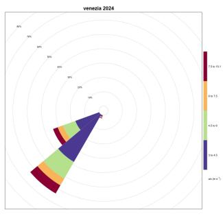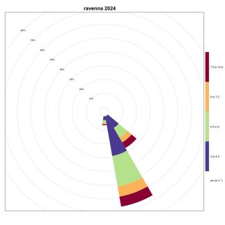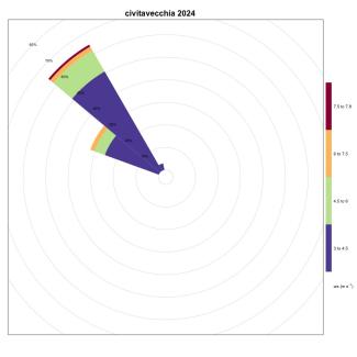 As can be seen from Table 1, the stations located in the Tyrrhenian area show very low frequencies of winds favorable to the generation of upwelling, while in the Adriatic Sea, these frequencies are on average higher, thanks also to the contribution of the Bora, a strong wind that blows from the North-East and which generates upwelling along the coastal line to the East of the basin. The stations located in the Ionian Sea and in the Sicilian Channel indicate these areas as favorable for the generation of upwelling. A significant increase was recorded in 2024, compared to 2023, at the Ancona station. The area of the Strait of Messina is confirmed to be, as also known from the literature, an area strongly affected by upwelling mainly due to hydrodynamic phenomena; the ionic waters of the Strait are in fact colder than those of the surrounding basins. Also in 2024, as in 2023, an increase in winds favorable to the generation of upwelling in the Ionian area near Crotone was maintained compared to 2022. Furthermore, a moderate increase was recorded at the stations of Bari, Ortona, Palermo, Ravenna, Vieste and Venice. The station that generally indicates the most favorable area for the generation of upwelling phenomena is always that of Carloforte.