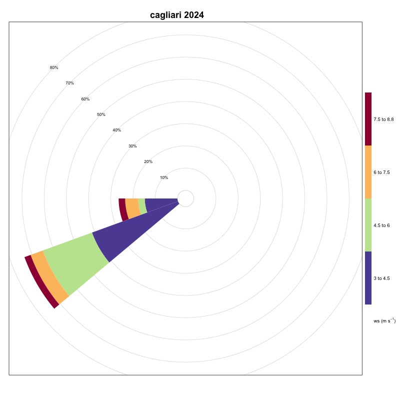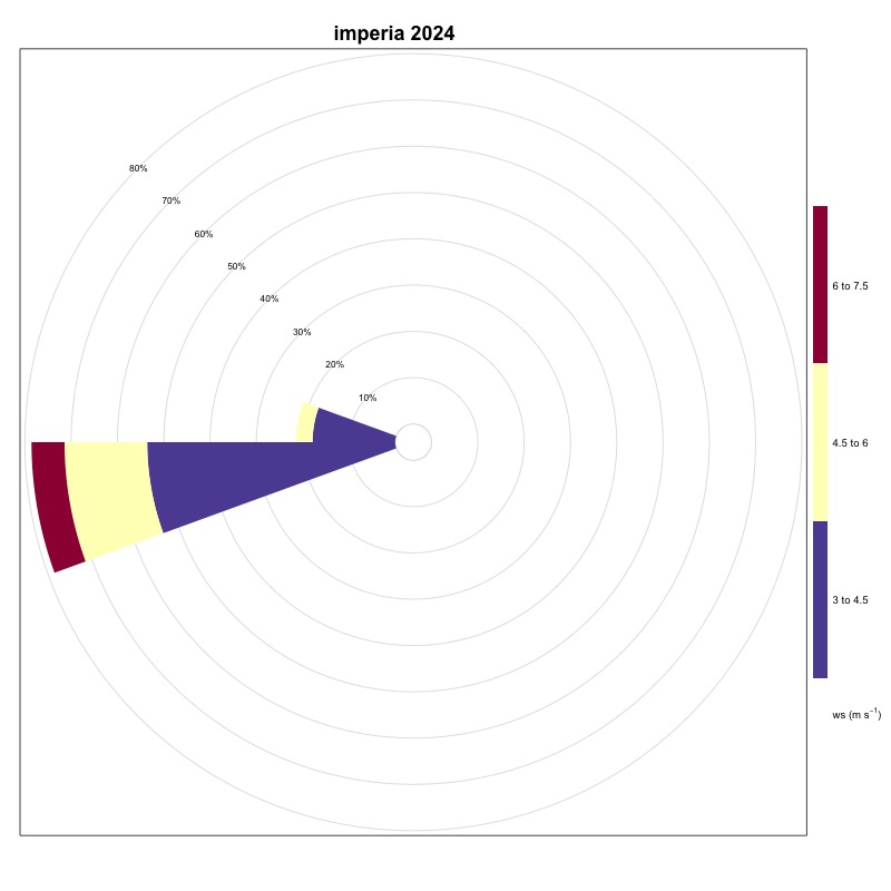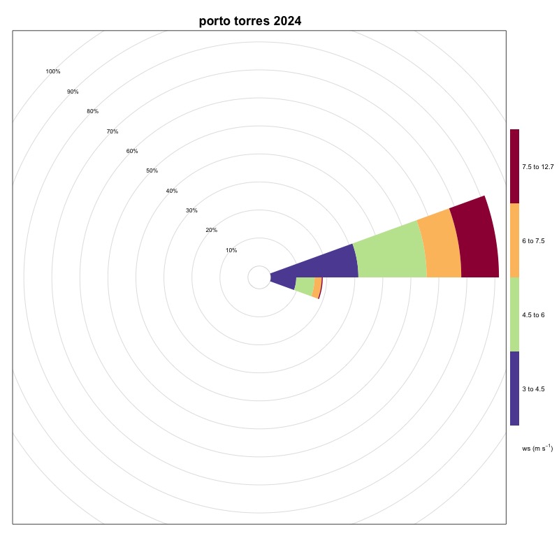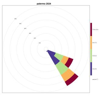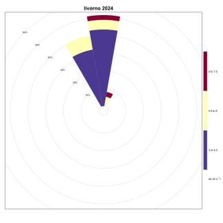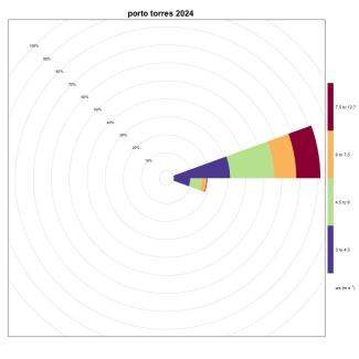 Finally, in Sardinia, Cagliari (Figure 3) has a percentage of events coming from the sector between 230° and 260° equal to 0.4%, Porto Torres (Figure 17) has a frequency of 3.15% in the 75° - 105° directional sector, while Carloforte (Figure 4) with a frequency of 13.88% is once again the station with the highest number of favorable events, found in the directional sector between 345° and 15°.