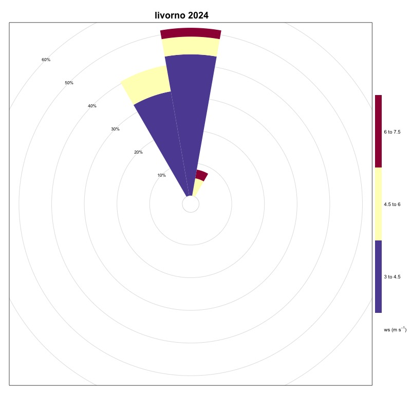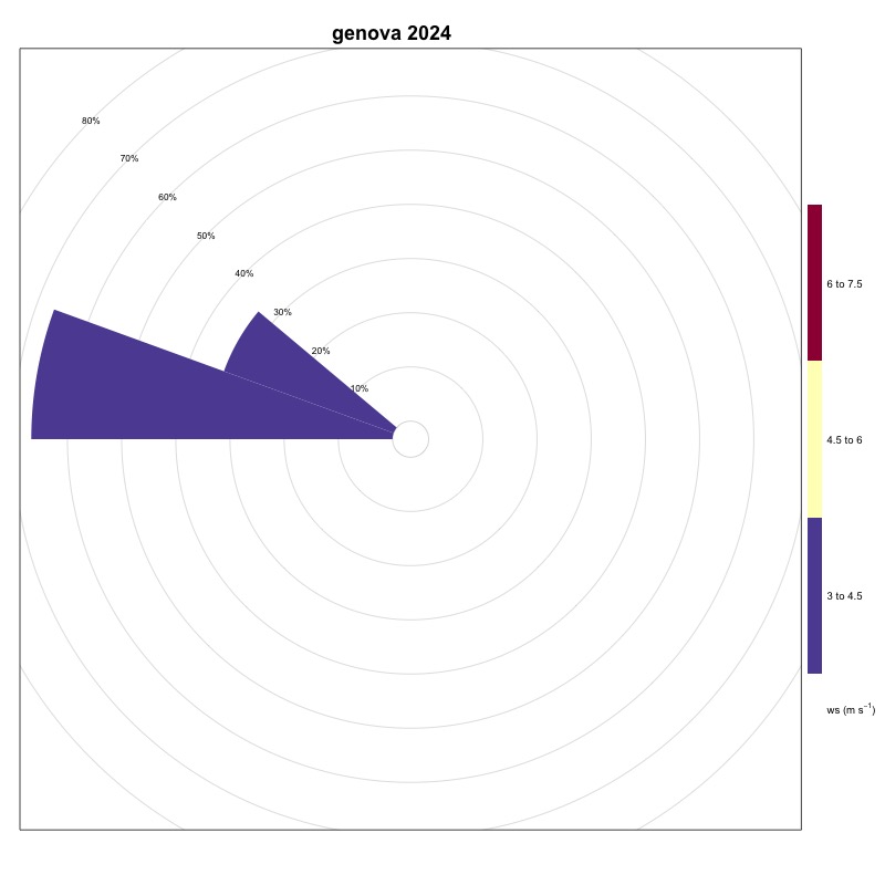 The frequency of events for the stations of Imperia (Figure 8), Genoa (Figure 7), Livorno (Figure 9) and Civitavecchia (Figure 5) are respectively equal to 0.32%, 0.07%, 0.42% and 1.2%.