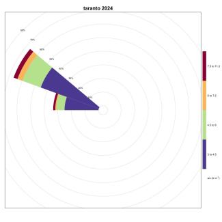 The frequencies calculated in Ionian Sea come from the stations of Taranto (Figure 21) and Crotone (Figure 6), with values equal to 1.51% and 8.31% and the following directional sectors: