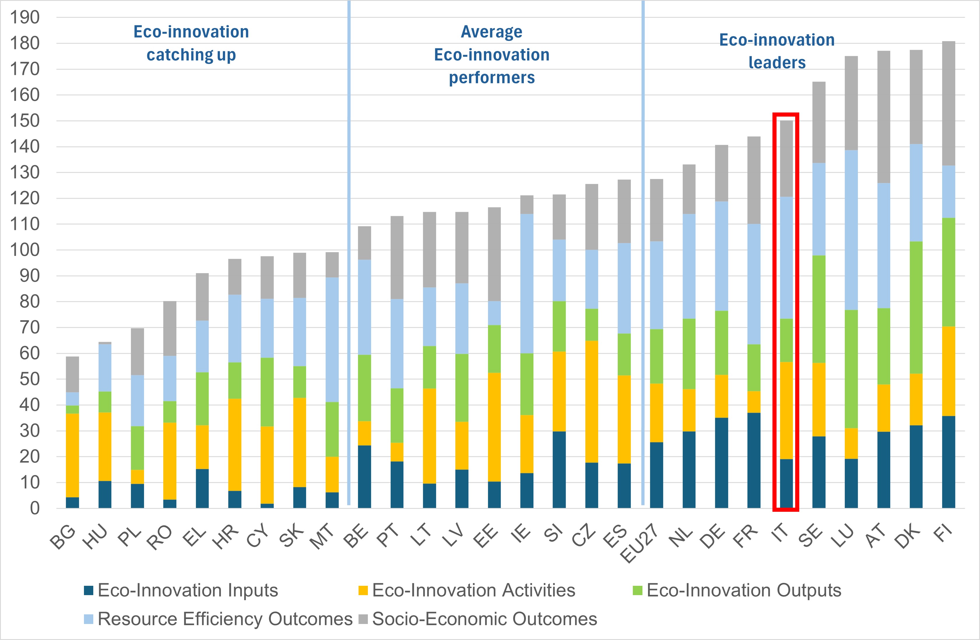 Eco-innovation is any innovation that makes progress towards a greener and more sustainable economy by reducing environmental pressures, increasing resilience, or using natural resources more efficiently. The Eco Innovation Index is based on the eco-innovation scoreboard, which includes 12 indicators divided into five thematic areas: Eco-innovation inputs, which include investments in financial and human capital in eco-innovative activities; Eco-innovation activities, which define the extent to which companies in a given country are active in eco-innovation; Eco-innovation outputs, which measure the results of eco-innovation activities in terms of number of patents and academic literature; Resource efficiency outcomes, which identify a country’s resource efficiency and greenhouse gas emission intensity; Socio-economic outcomes, which aim to measure the positive results of eco-innovation both socially and economically. The Eco Innovation Index therefore measures Italy’s eco-innovation performance compared to the EU27 average (EU27 base = 100 in 2014), on the basis of 12 sub-indicators distributed across five thematic areas: inputs, activities, outputs, resource efficiency and socio-economic outcomes. It is calculated annually within the framework of the European Commission’s Eco Innovation Scoreboard.