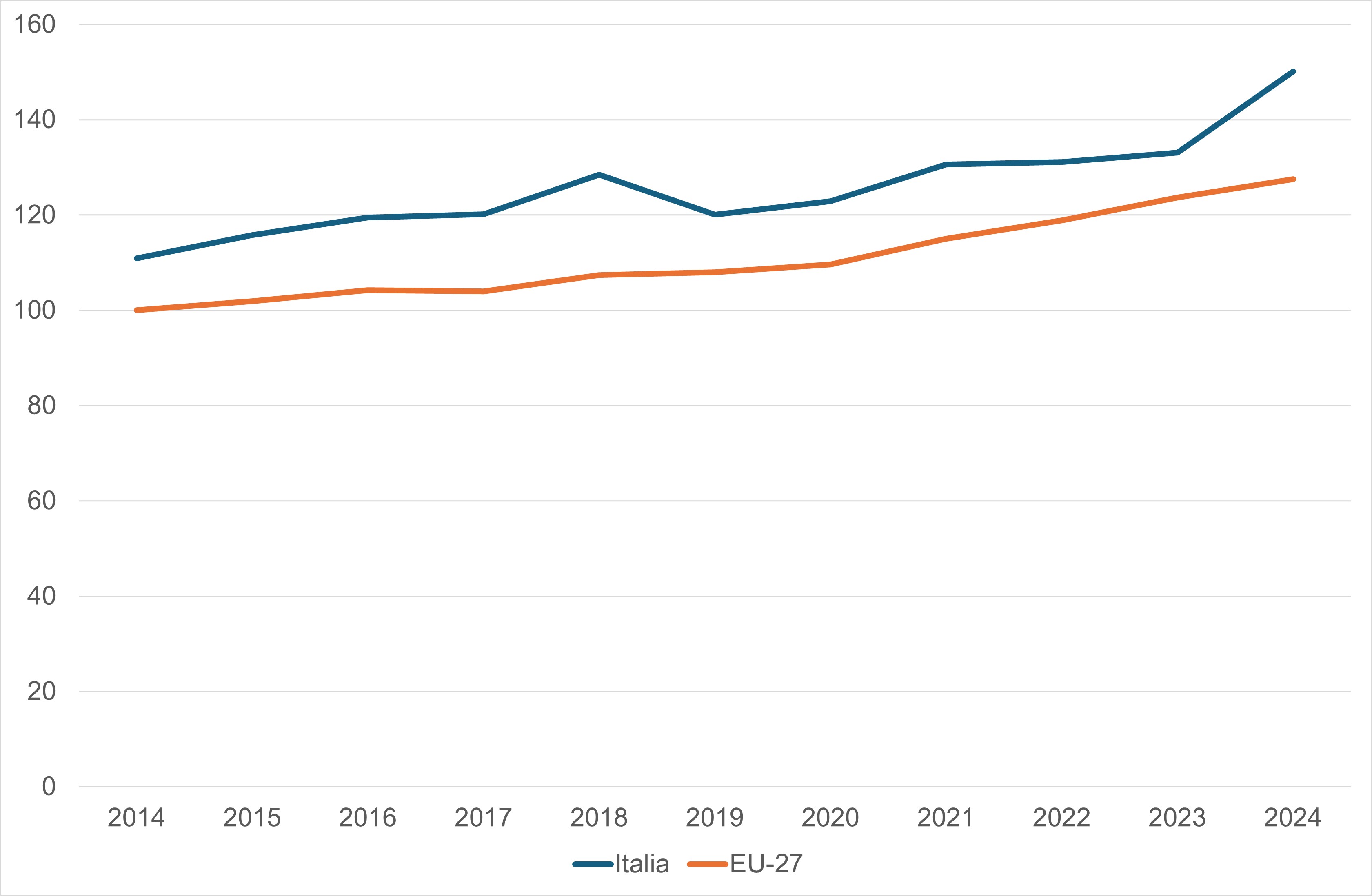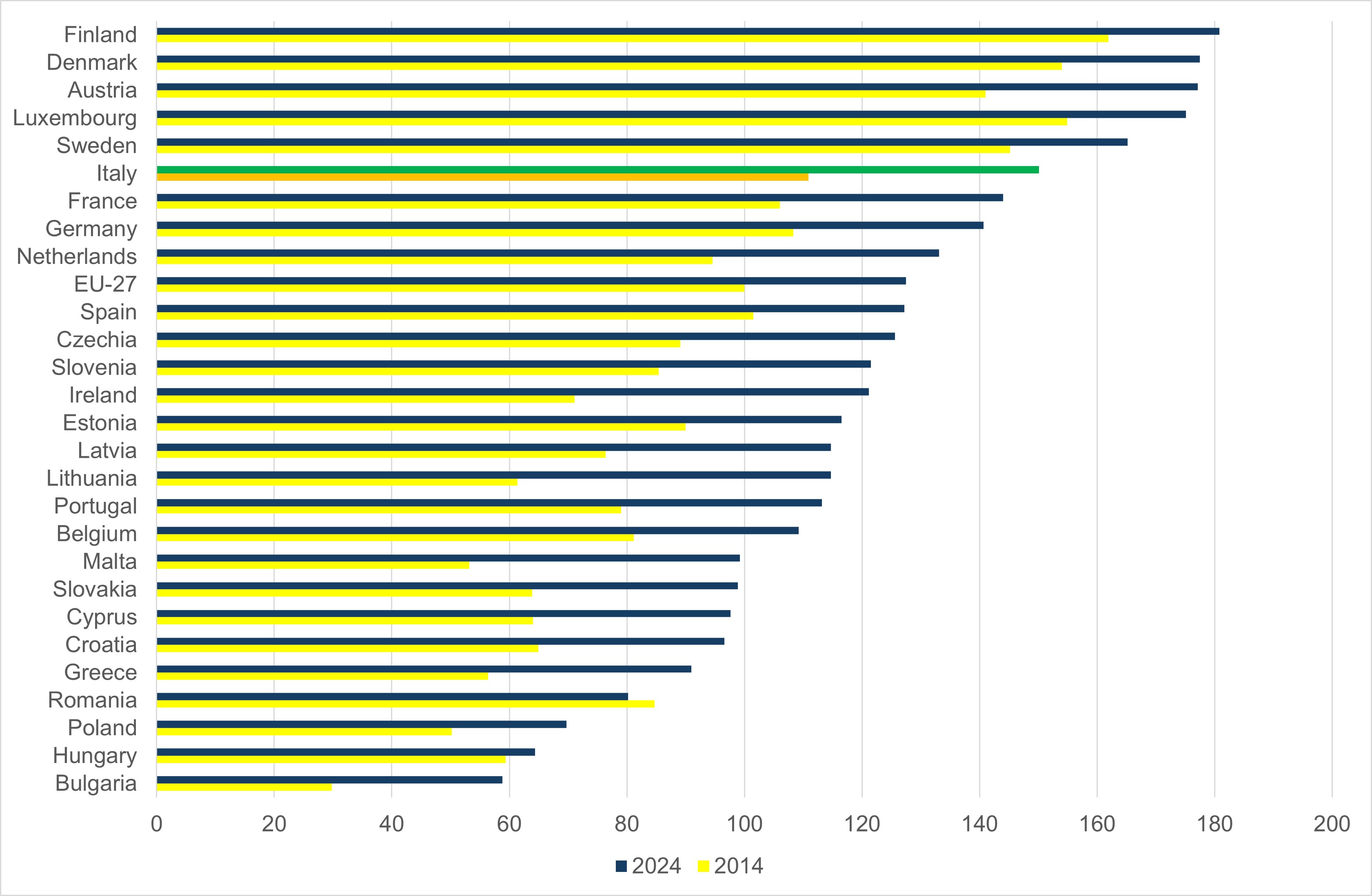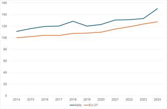 The aggregate index is obtained as the unweighted arithmetic mean of the 12 normalized sub-indicators. The values are compared with the EU27 base = 100 to measure Italy’s relative growth. The score of a Member State in a given year t is calculated as the ratio between its score and that of the EU in the base year (t–10), thus offering a standardized and long-term perspective on the progress made.