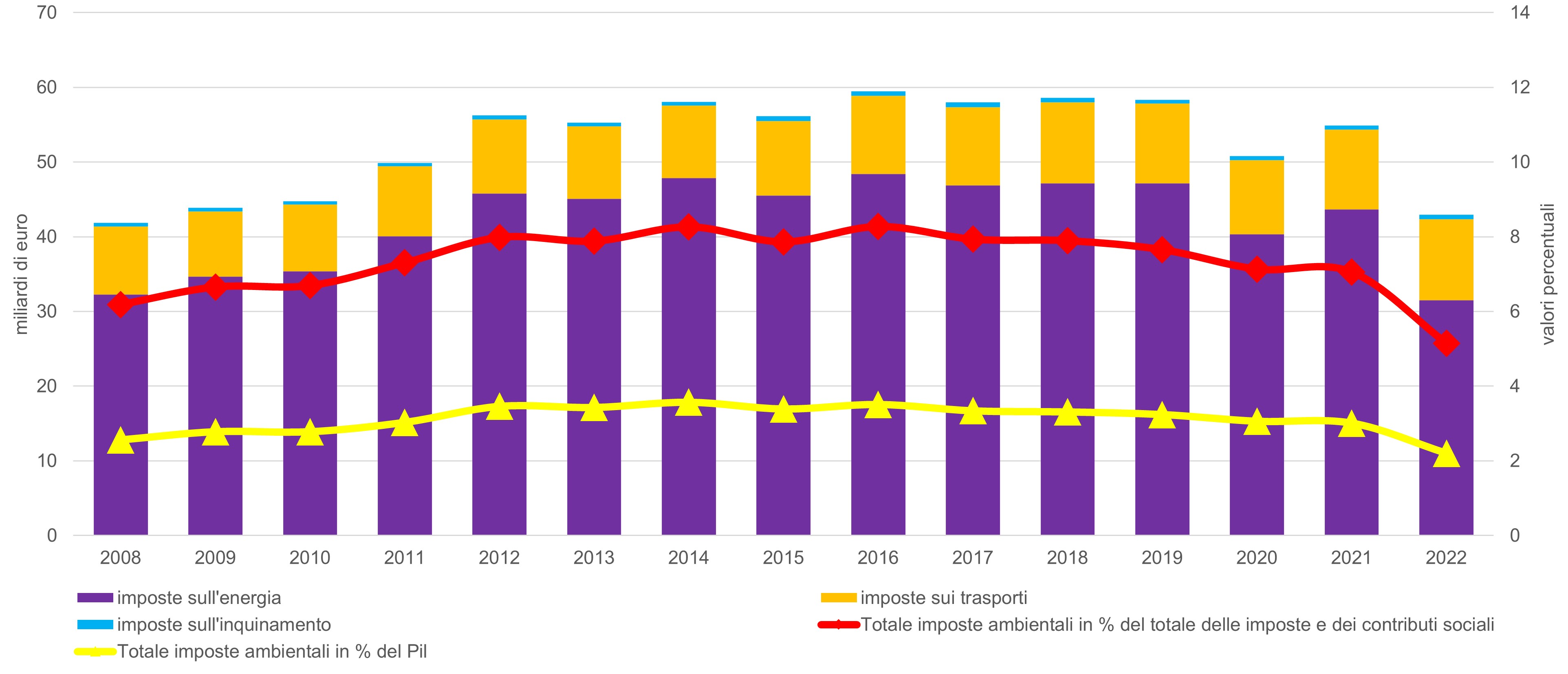 This indicator provides information on revenue by category of environmental tax and on the units paying the taxes. An environmental tax is characterized by having a tax base in a physical unit, or a proxy thereof, that has proven negative effects on the environment. Four main areas of environmental taxation can be identified: energy, transport, pollution, and natural resources. For energy, taxes apply to energy products used both for stationary and mobile pollution sources (i.e., for transport purposes); carbon dioxide taxes also fall within this area, as they are levied on energy products. The transport category does not include fuel use for transport; instead, it mainly includes taxes on ownership and use of vehicles and other means of transport. The pollution category includes taxes on atmospheric emissions (e.g., NOx and SOx), water discharges, waste management, and noise. The last area, for which there are no taxes in Italy, includes taxes on the extraction of natural resources except for oil and gas. The indicator measures revenue by tax category and the revenue from environmental taxes by unit (resident or non-resident) paying the tax. Below is the breakdown of Italy’s environmental tax categories: - Energy: border surcharge on non-condensable gases; border surcharge on mineral oils; tax on mineral oils and derivatives; tax on non-condensable gases; additional electricity tax by municipalities and provinces; electricity tax and system charges for renewable sources; natural gas tax; coal consumption tax; contribution on revenues of energy sector operators to the Energy, Gas and Water Authority; revenues from the Central Italian Storage Organization; proceeds from the use of emission permits. - Transport: Public Motor Vehicle Register (PRA); tax on motor liability insurance; vehicle taxes for businesses; vehicle taxes for households; air taxi tax; tax on boats and aircraft. -Pollution: special landfill levy; tax on sulfur dioxide and nitrogen oxides emissions; provincial tax for environmental protection; regional tax on aircraft noise emissions.