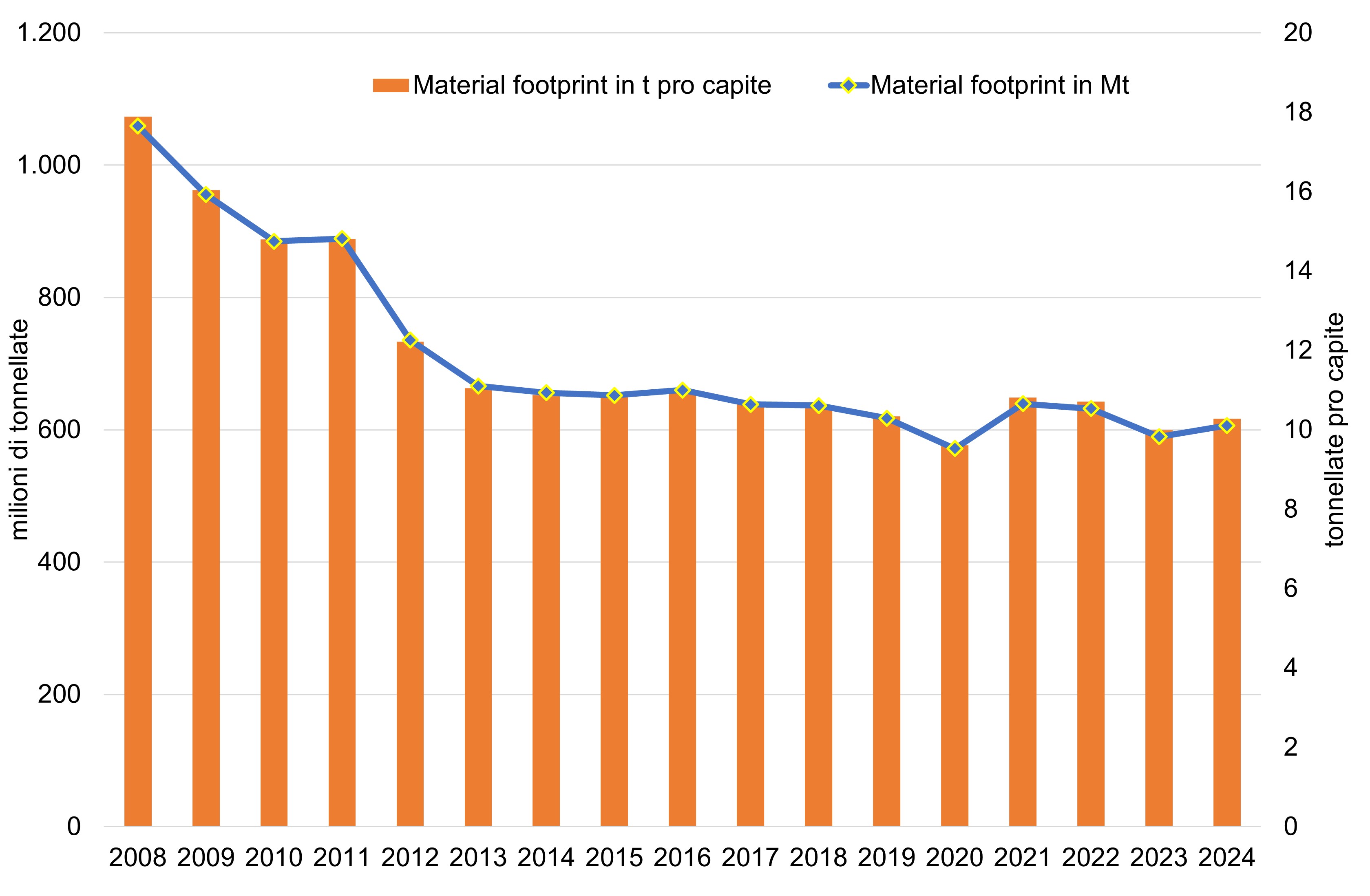 Between 2008 and 2024, the Italian material footprint recorded a significant reduction, going from over 1 billion tonnes (17.9 tonnes per capita) to just over 600 million tonnes (10.3 tonnes per capita), with an overall decrease of about –43% in absolute terms and –42% per capita, outlining a positive trend (Figure 1, Table 1).