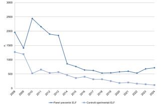 Calculation of the overall number of experimental controls for ELF plants on the national territory. Calculation of the total number of preventive opinions for ELF systems on the national territory. In the calculation, the regions that provided updated and complete data are considered.