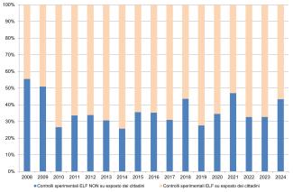 Analyzing the period 2008-2023, in 2009 there was a decrease in preventive opinions equal to 28.1% (going from 1,961 to 1,409), while in 2010, compared to the previous year, a strong increase (+73.4%) (going from 1,409 to 2,443). From 2011 to 2018, a gradual decline continued, until reaching, in 2018, a value of 527 (-75.6% compared to 2011). In 2019 there is an increase, which, with the exception of 2022 in which there is a decrease (-8.9%), continues until 2023 (+25.9%) (going from 541 to 681). Relative to the experimental controls carried out, the trend over time is rather variable but characterized by a general decrease, in fact, from 2008 to 2023 they decreased by 89% (going from 1,269 to 140). As can be seen from Figure 2, the ELF checks carried out by ARPA/APPA on citizens' complaints compared to the total checks carried out present a rather variable trend: in 2008 the minimum was recorded (44.4%) (equal to 564 out of 1,269) while in 2014 the maximum was recorded (74.2%) (equal to 343 out of 462); in 2023 compared to 2022 there is a decrease of 2.3 percentage points. Both the regions that provided complete data for the period under examination 2008-2023 were considered, as were those for which it was possible to integrate the missing information by reporting the useful information from the previous year or, in the absence of this, that from the first subsequent year available (Piedmont, Valle d'Aosta, Lombardy, Trentino-Alto Adige, Veneto, Friuli-Venezia Giulia, Liguria, Emilia-Romagna, Tuscany, Umbria, Marche, Abruzzo, Puglia and Basilicata).
