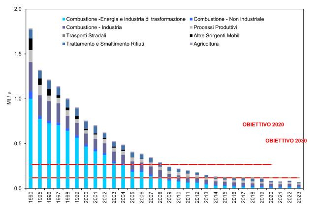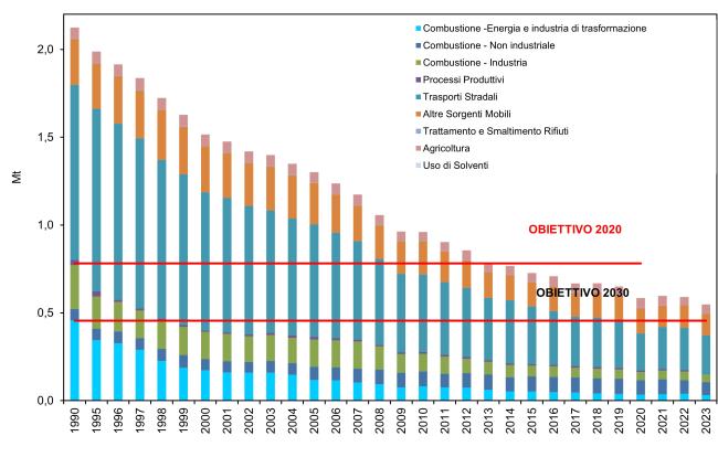 The indicator describes the trend in national emissions of the acidifying substances SOx, NOx, and NH₃, both in total and by sector, highlighting the decreasing trend from 1990 to 2023 (-72.3%). With reference to Directive (EU) 2016/2284 of the European Parliament and of the Council on the reduction of national emissions of certain atmospheric pollutants—which defines national emission reduction commitments compared to 2005, applicable from 2020 to 2029 and from 2030 onwards—sulphur oxides and ammonia achieved the required 2020 reduction target as early as 2009, while nitrogen oxides reached it in 2014.