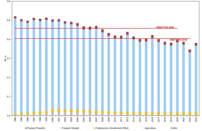 The emissions of the three acidifying substances expressed in acid equivalents have decreased overall from 1990 to 2023 (-72.3%). In 2023 they are distributed as follows: sulfur oxides have a weight of 6.1%, a sharp reduction compared to 1990 (-96%); emissions of nitrogen oxides and ammonia account for 32.9% and 61.0% respectively, both decreasing (-73.8%, -27.8%) but with an increasing relative weight compared to 1990 (Table 2). In reference to the reduction commitments imposed by the legislation, sulfur oxides, already since 2009, with a decrease of 41% compared to 2005 (Figure 1), and ammonia, with a decrease of 7% compared to 2005 (Figure 3), reach the reduction percentage imposed for 2020; while nitrogen oxides reached the reduction percentage set for 2020 in 2014, with a reduction of 41% (Table 1, Figure 2).