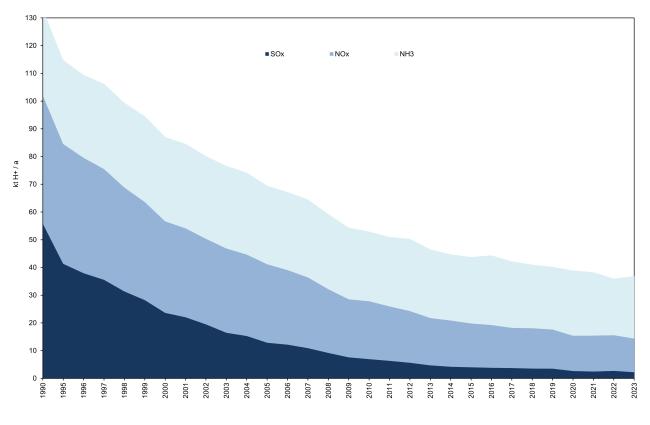 In 2023, total emissions of the three acidifying substances amounted to 36.8 kt H⁺/year.