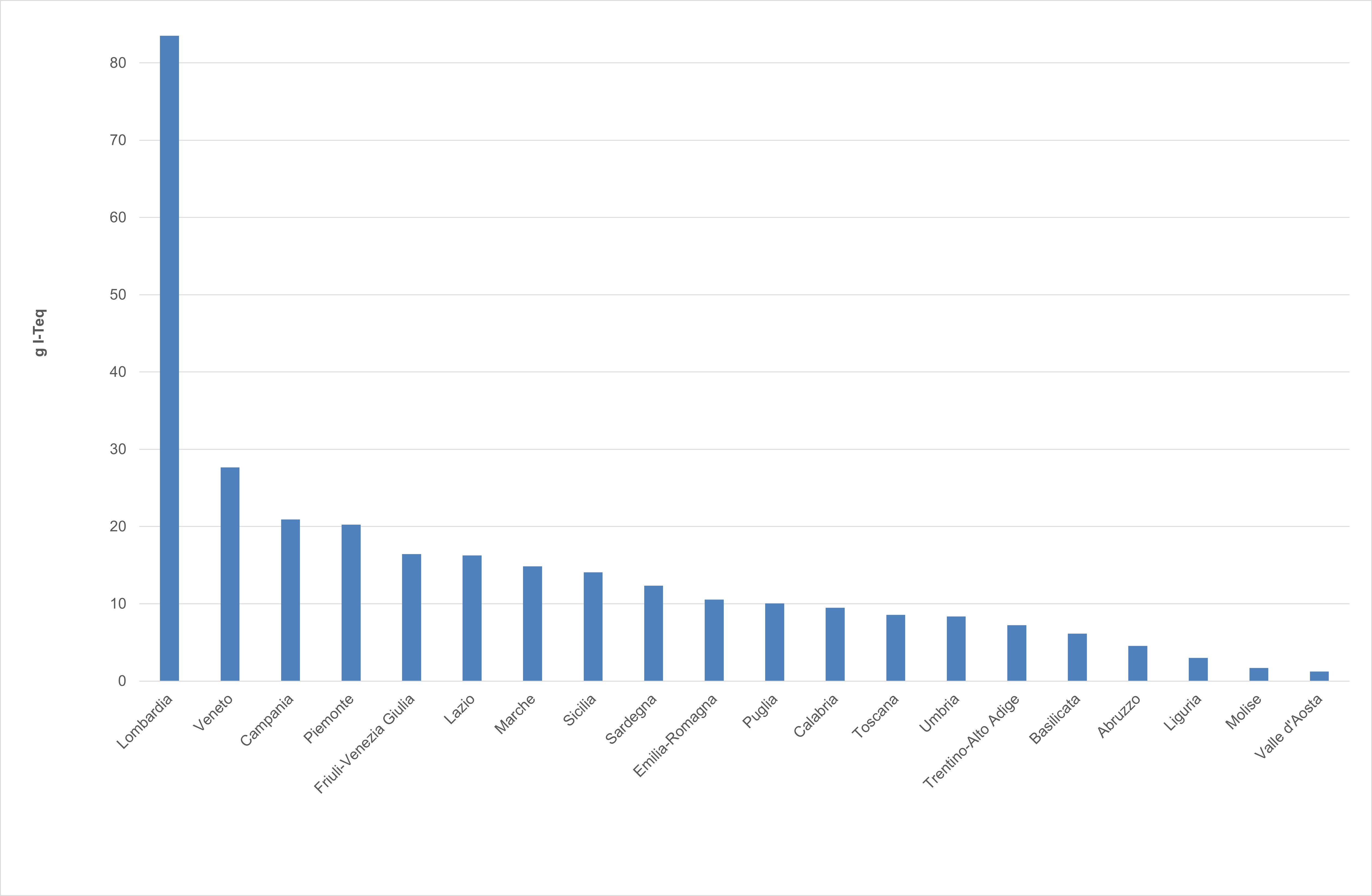 Analyzing the regional detail, it can be seen that in 2023 the largest share of both PAH emissions (7.2 t) and dioxins and furans (83.5 g I-Teq) originated from Lombardy (Table 2, Figures 2 and 3).