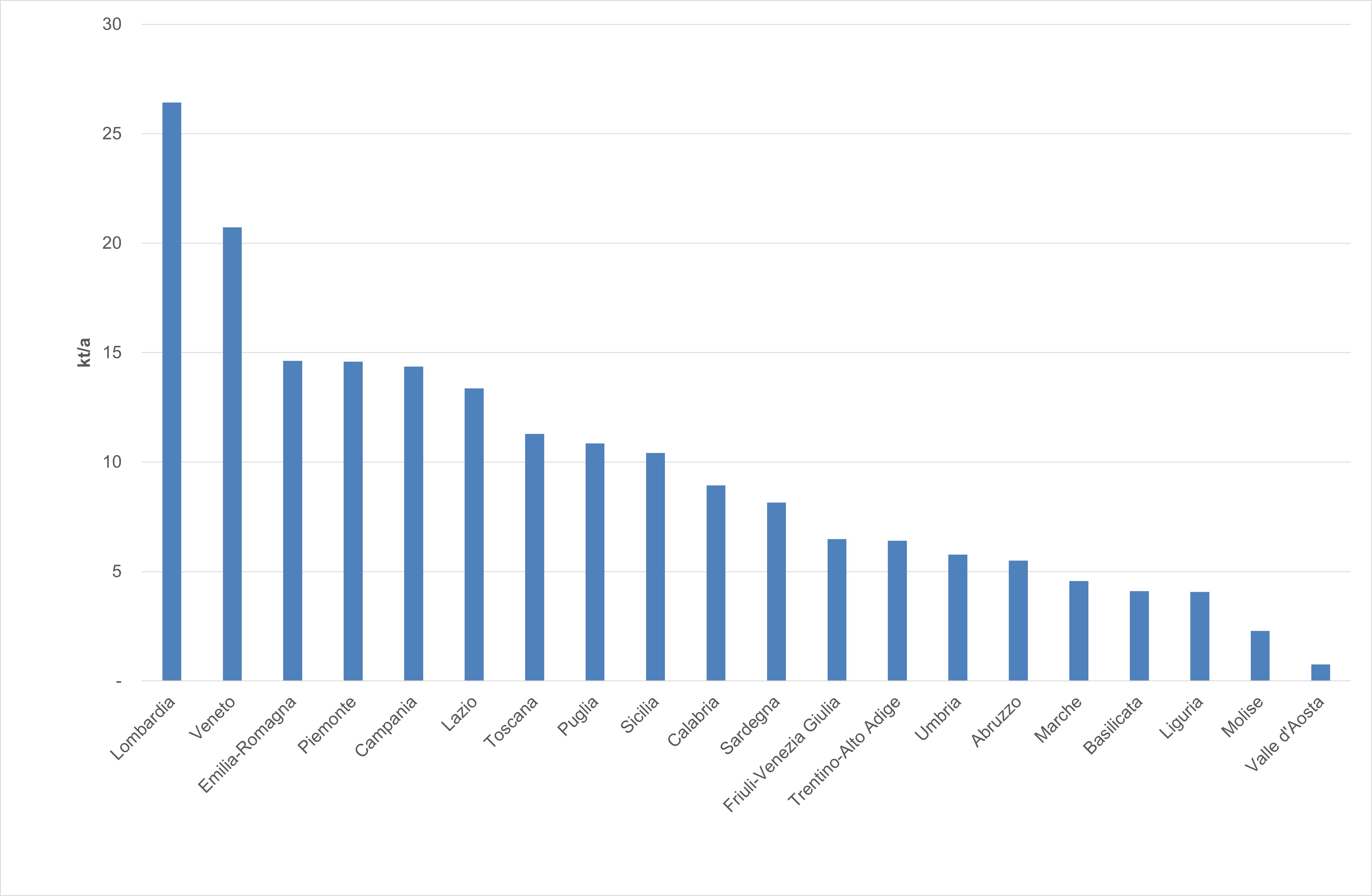 An analysis of the data at a regional level shows that the regions that contribute most to PM10 emissions are Lombardy (26.4 kt/a) and Veneto (20.7 kt/a), while those with a lower impact are Molise (3.3 kt/a) and Valle d'Aosta (0.8 kt/a) (Table 2 and Figure 2).