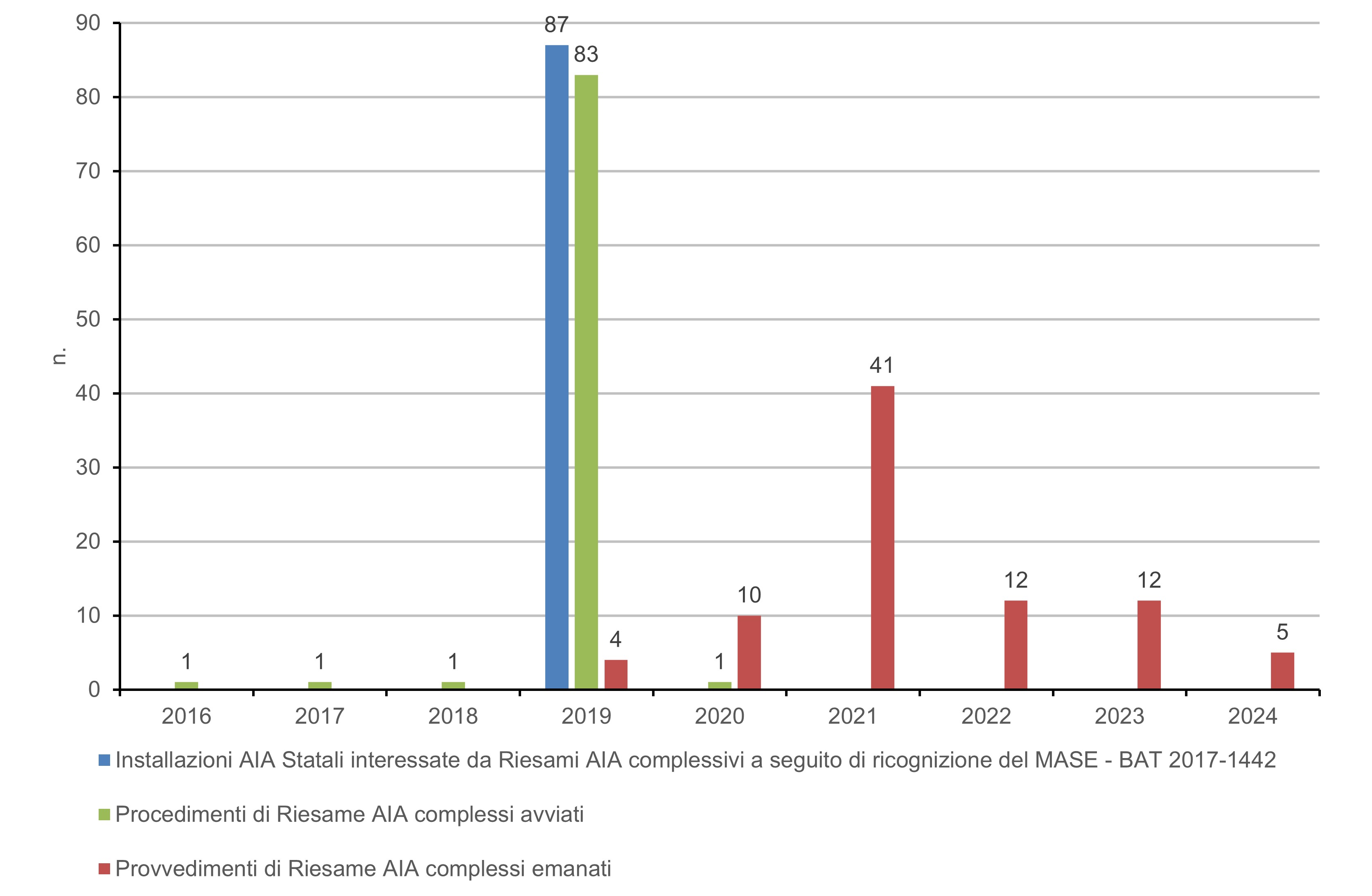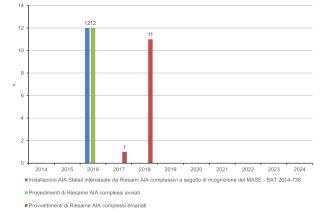 The indicator represents the number of AIA provisions for installations under state jurisdiction (overall review in compliance with art. 29-octies of Legislative Decree 152/06) issued by MASE, compared to the number of proceedings initiated, aimed at issuing AIA provisions, starting from the date of publication in the Official Journal of the European Community of the Commission's implementing decisions of 9 October 2014 - 2014/738/EU, of 31 July 2017 – UE/2017/1442 and of 21 November 2017 – UE/2017/2117. Furthermore, the number of all AIA provisions issued by the MASE is provided, broken down by overall AIA review, partial AIA review, review initiated in compliance with AIA requirements, AIA update for substantial modification, AIA update for non-substantial modification and release of new AIA, which represent all types of AIA proceedings.