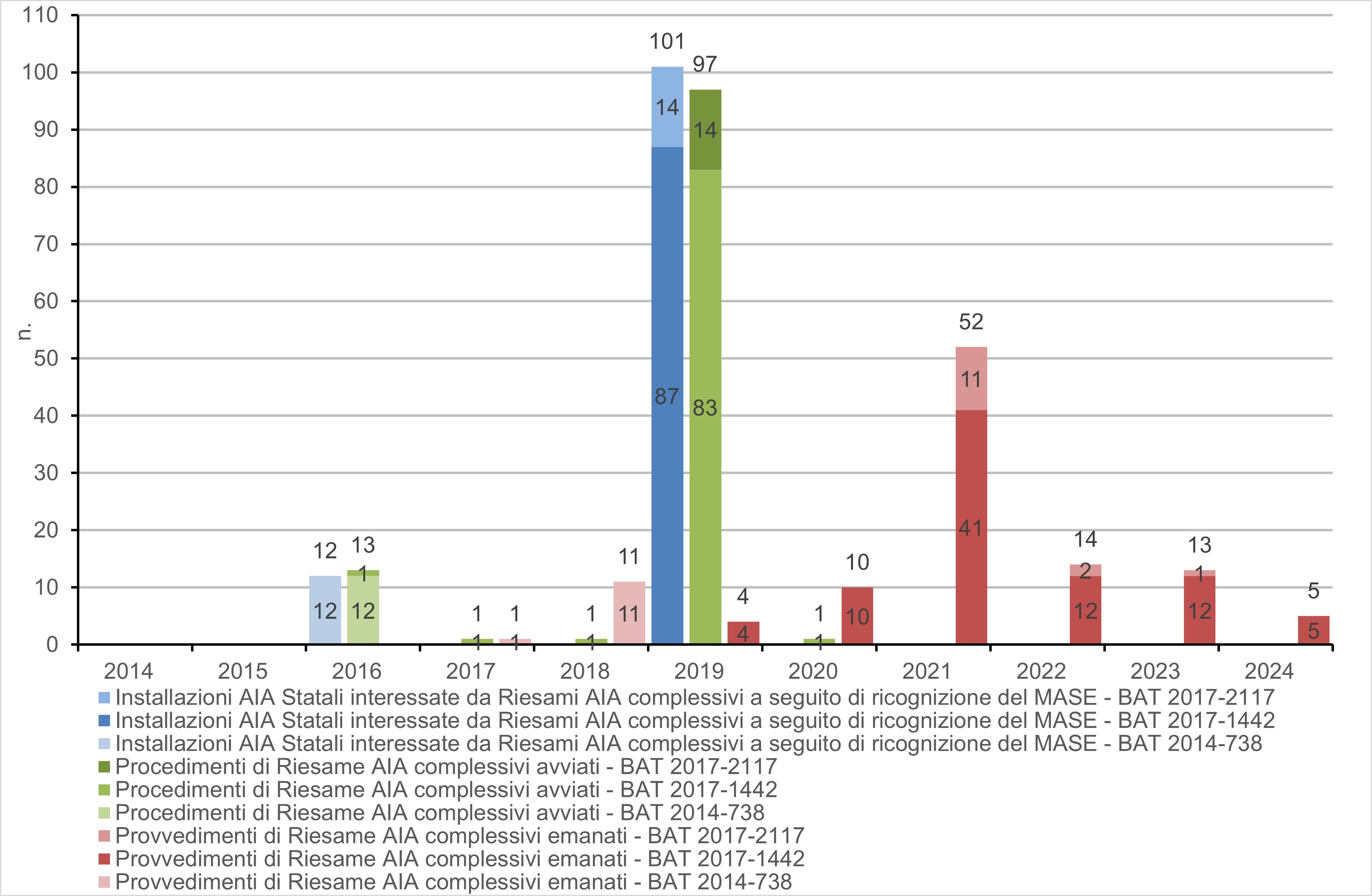 Quantify the number of AIA provisions (overall review) issued by MASE to operational installations, on the basis of the provisions of European legislation in order to prevent, reduce and keep under control emissions into the environment from industrial installations in application of BAT (Best Available Techniques) Commission Implementing Decision of 9 October 2014 – 2014/738/EU, of 31 July 2017 – UE/2017/1442 and Commission Implementing Decision of 21 November 2017 – EU/2017/2117.
