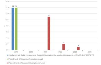 Figure 4: Procedures initiated and provisions issued by MASE for state AIA installations following the scheduling of the overall reviews regarding the BAT Conclusions - Commission Implementing Decision of 9 October 2014 - 2014/738/EU, of 31 July 2017 - 2017/1442/EU and of 21 November 2017 - 2017/2117/EU