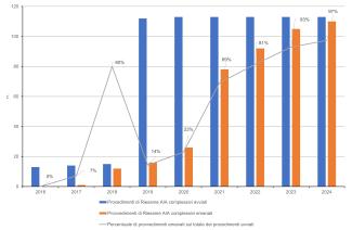 Starting from 2016, the issuing of AIA measures under state competence began in application of the Commission's implementing decisions of 9 October 2014 - 2014/738/EU, of 31 July 2017 - UE/2017/1442 and of 21 November 2017 - UE/2017/2117. From the analysis of the trend for the period 2016-2024 it can be seen that the percentage of AIA provisions issued by MASE out of the total procedures initiated is growing, reaching 97% in 2024, therefore approaching the objective of 100% (Figure 8).