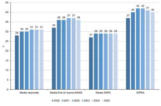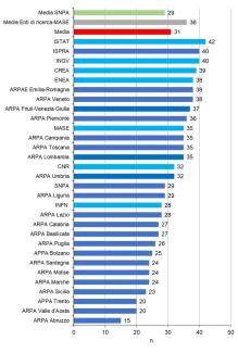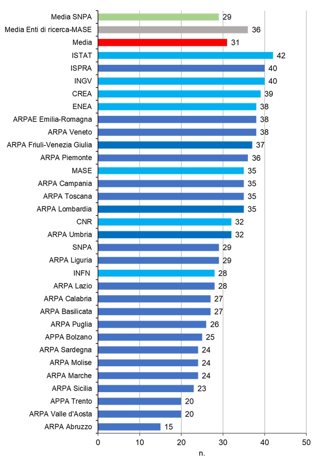 In July 2025 it is highlighted that the offer of environmental information and communication tools on the web by the monitored institutions is stable compared to 2024 both with regard to the overall average of the monitored websites (31 points compared to a maximum value of 46 points), and if we refer to the average of the SNPA websites (29 points), while the average of the sites of the research bodies and MASE goes from 37 points to 36. There are 15 sites that obtained a score higher than the overall average. The institutional site richest in web tools and content is that of Istat (42 points).