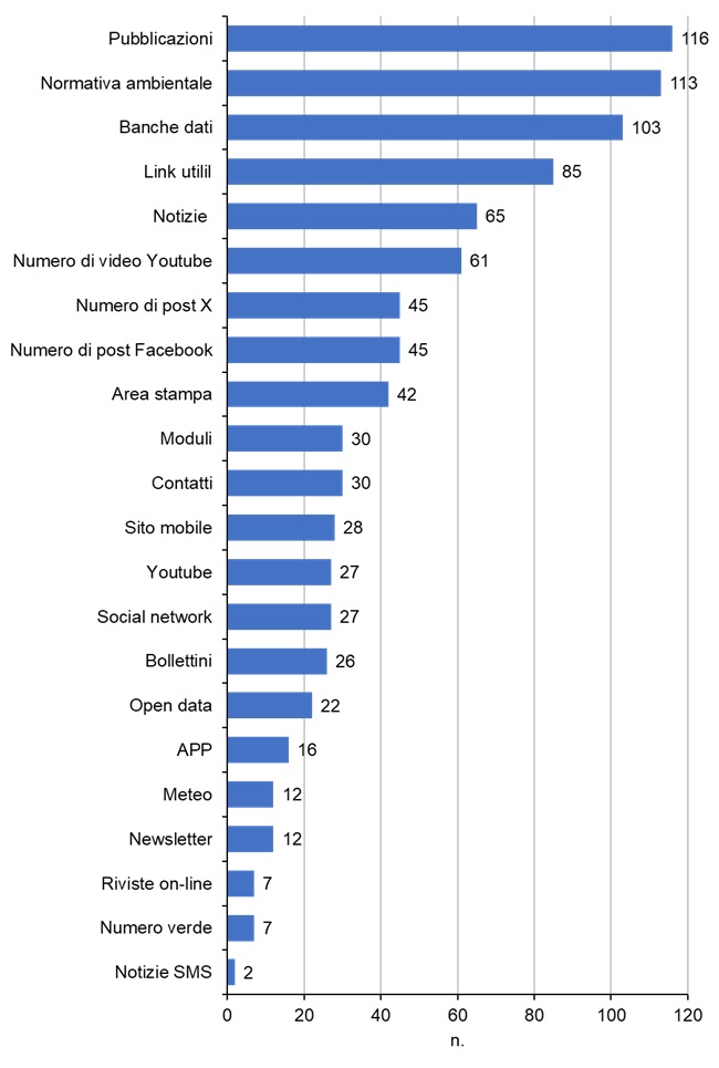 The main types of services and sections (22 types) relating to environmental information and communication offered by the websites of the SNPA, MASE and some of the main research bodies have been identified. The types of services and sections considered now "outdated" or present on the sites subject to the investigation due to legal obligation, such as the certified e-mail, were discarded. For some typologies the presence/absence within the site was verified, in case of presence a score of 1 was assigned, for other typologies of tools or services in addition to the presence the quantity was evaluated (e. g.: no. Of news; no. Of posts X).
