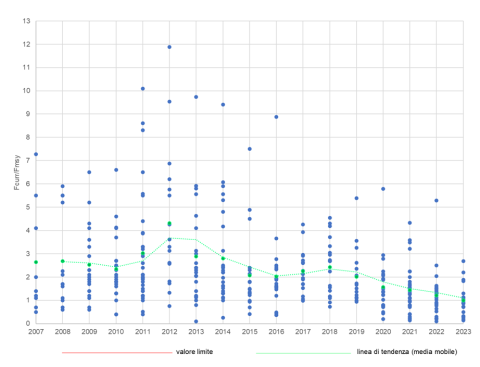 During the period considered (2007–2023), the average exploitation rate of fish stocks — expressed as the mean ratio between current fishing mortality and that corresponding to the Maximum Sustainable Yield (Fcurr/FMSY) — remained generally above the sustainability threshold.
