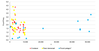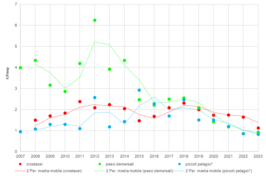 During the period considered (2007–2023), the average exploitation rate of fish stocks — expressed as the mean ratio between current fishing mortality and that corresponding to the Maximum Sustainable Yield (Fcurr/FMSY) — remained generally above the sustainability threshold.
