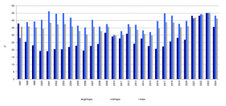 Figure 1: Annual trend in the percentage distribution of sampled trees for which a degree of defoliation > 25% (classes 2-4) was recorded.