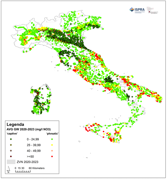 In the four-year period 2020-2023, the results relating to the distribution of monitoring stations in the different quality classes (0-24.99 mg/l; 25-39.99 mg/l; 40-49.99 mg/l; ≥50 mg/l) highlighted that, out of 4,581 sampling points, 69.1% of the stations have an average concentration of nitrates in the four-year period lower than 25 mg/l, while 11.7% recorded an average concentration greater than or equal to 50 mg/l of nitrates (Table 2, Figure 1).