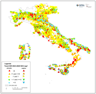 Each monitoring station, based on the average concentration of nitrates detected in the period in question, is assigned to one of the four quality classes and for each class the percentage of stations compared to the total stations analyzed is calculated. Furthermore, the trend is calculated for each station common to the two four-year periods, as the difference between the average nitrate value of the four-year period 2020-2023 and that of the previous four-year period 2016-2019. On the basis of the trend, each station is assigned to one of the five classes and for each class the percentage of stations compared to the total stations analyzed is calculated.
