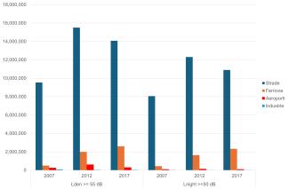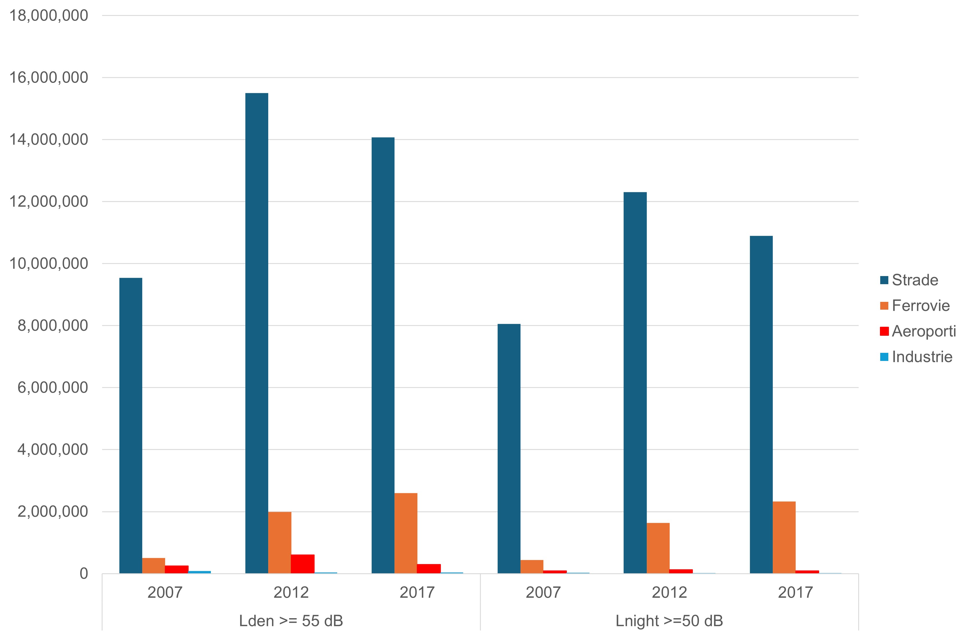 I dati relativi al 2012 e al 2017 si riferiscono agli agglomerati con più di 100.000 abitanti, alle strade  con più di 3 milioni di veicoli all'anno e alle ferrovie con più di 30.000 treni all'anno