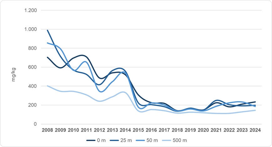 In 2024, the percentage of marine sediment samples with concentrations above the baseline reference value (193 mg/kg, Table 2) ranges between 45–54% of all analysed samples for the areas between 0 and 50 m from the platform, while in more distant areas (500 m) the percentage drops to 25%.