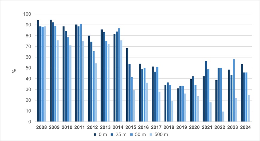 The share of exceedances of the baseline reference value for barium remains well above 50% in 2008–2014 at all stations around platforms—especially those between 0 and 50 m. In the subsequent period, a decline is observed, with a minimum in 2018–2019 and a stabilisation in 2021–2024, but at levels always below 60% of total samples.