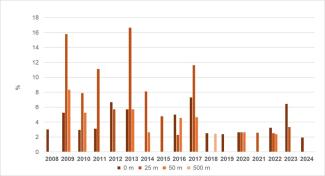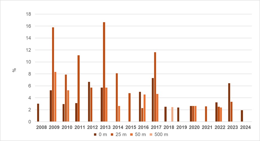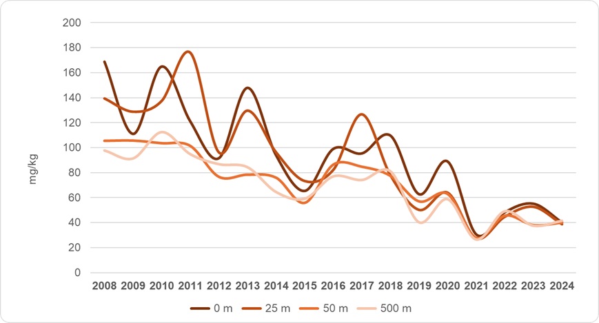 Mean total PAH concentrations show wide fluctuations over the period considered, particularly for sediments between 0 and 50 m from the platform (Figure 3), but the overall trend is clearly decreasing. The percentage of exceedances of the reference value also varies widely (Figure 4), especially in 2008–2017, when exceedances were observed in a share of samples between 8 and 16% at sediments collected 25 m from the platform; at all other sampling stations, the percentage remained between 2 and 8%. In 2018–2024, except for a peak of exceedances at the 0 m station in 2023, the share of exceedances for all sediments is around 2–3%.